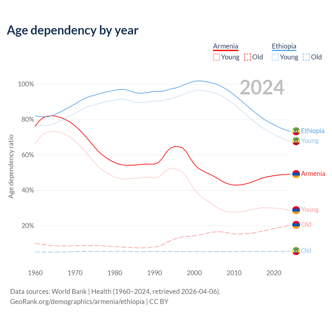 The share of older people aged 65 and over is 13.7% in Armenia and 3.23% in Ethiopia. Life expectancy in Armenia compared to Ethiopia .