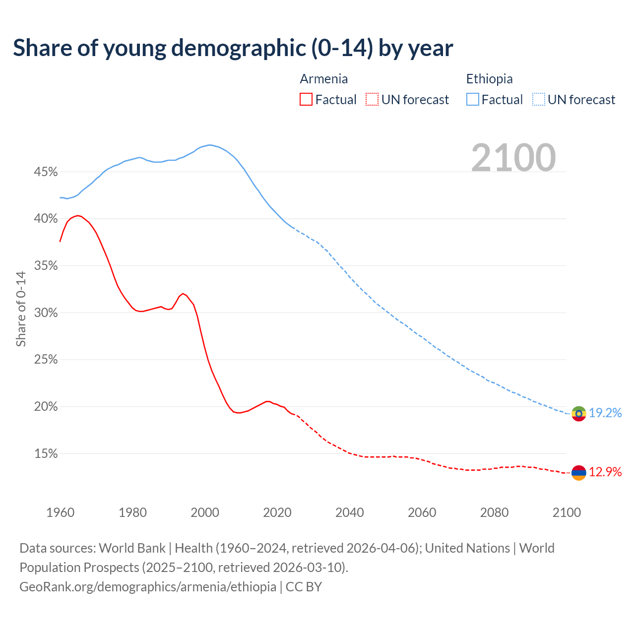 - The share of young demographic (0-15 years old) in Armenia is 19.2% vs 39.1% in Ethiopia.
