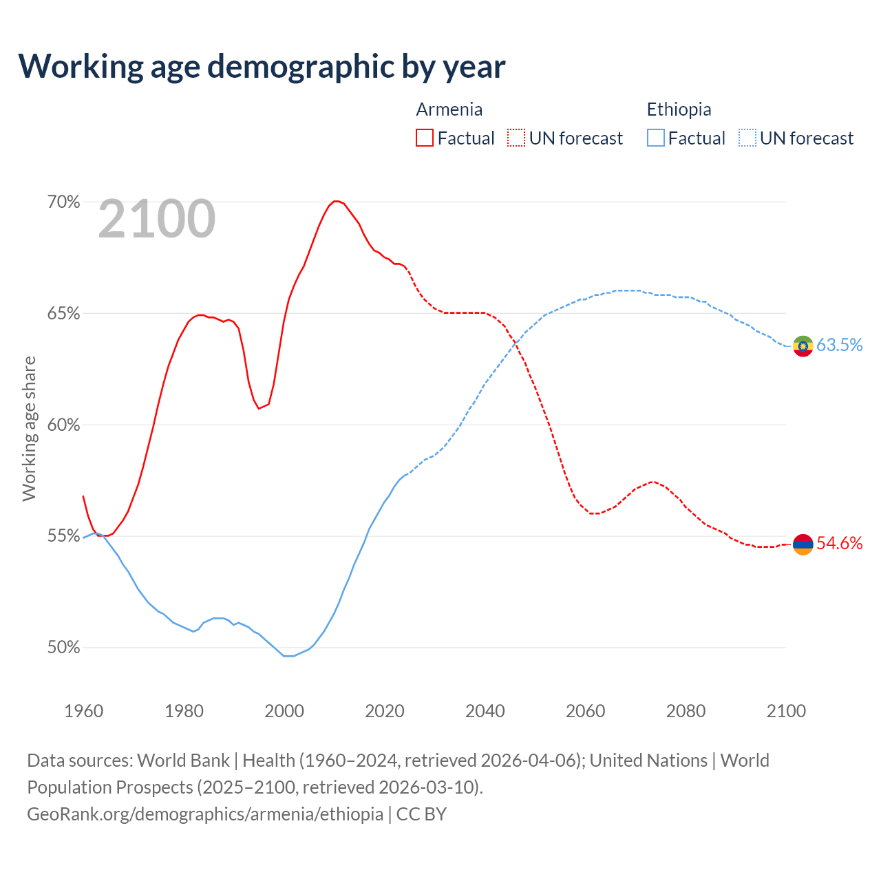 - Armenia has 2M working age adults (aged 15-64) vs 80.7M in Ethiopia.