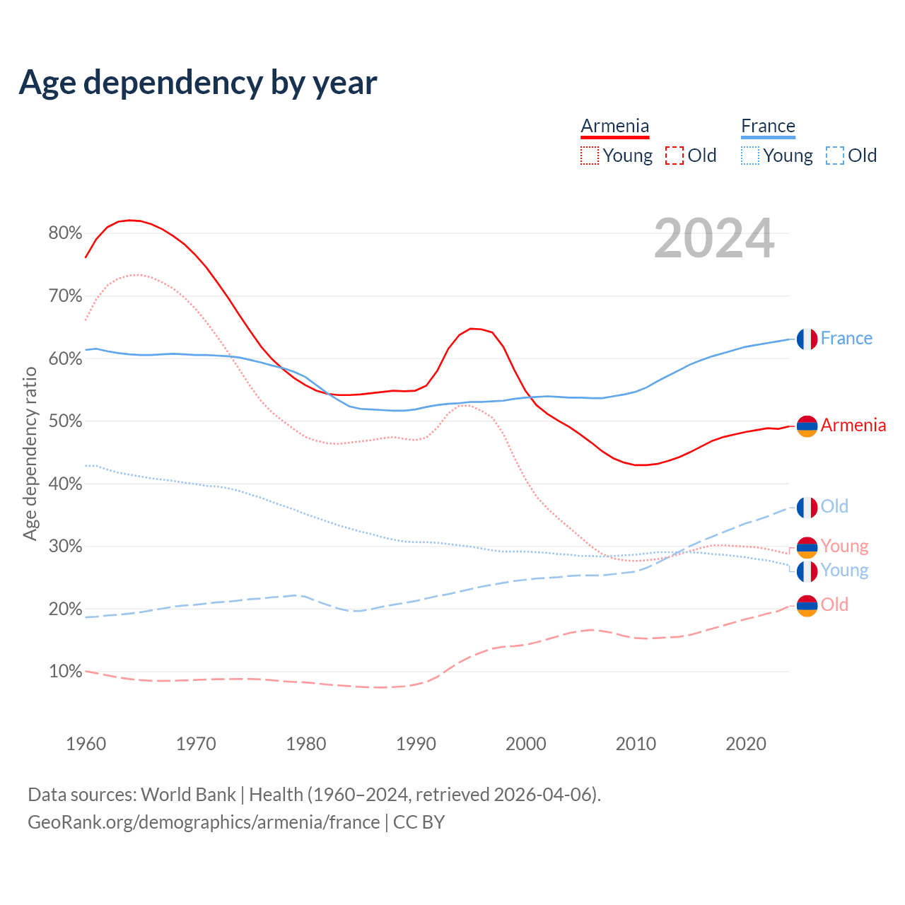 - Armenia is ranked 64/196 by median age (oldest to youngest) vs 29/196 for France.
