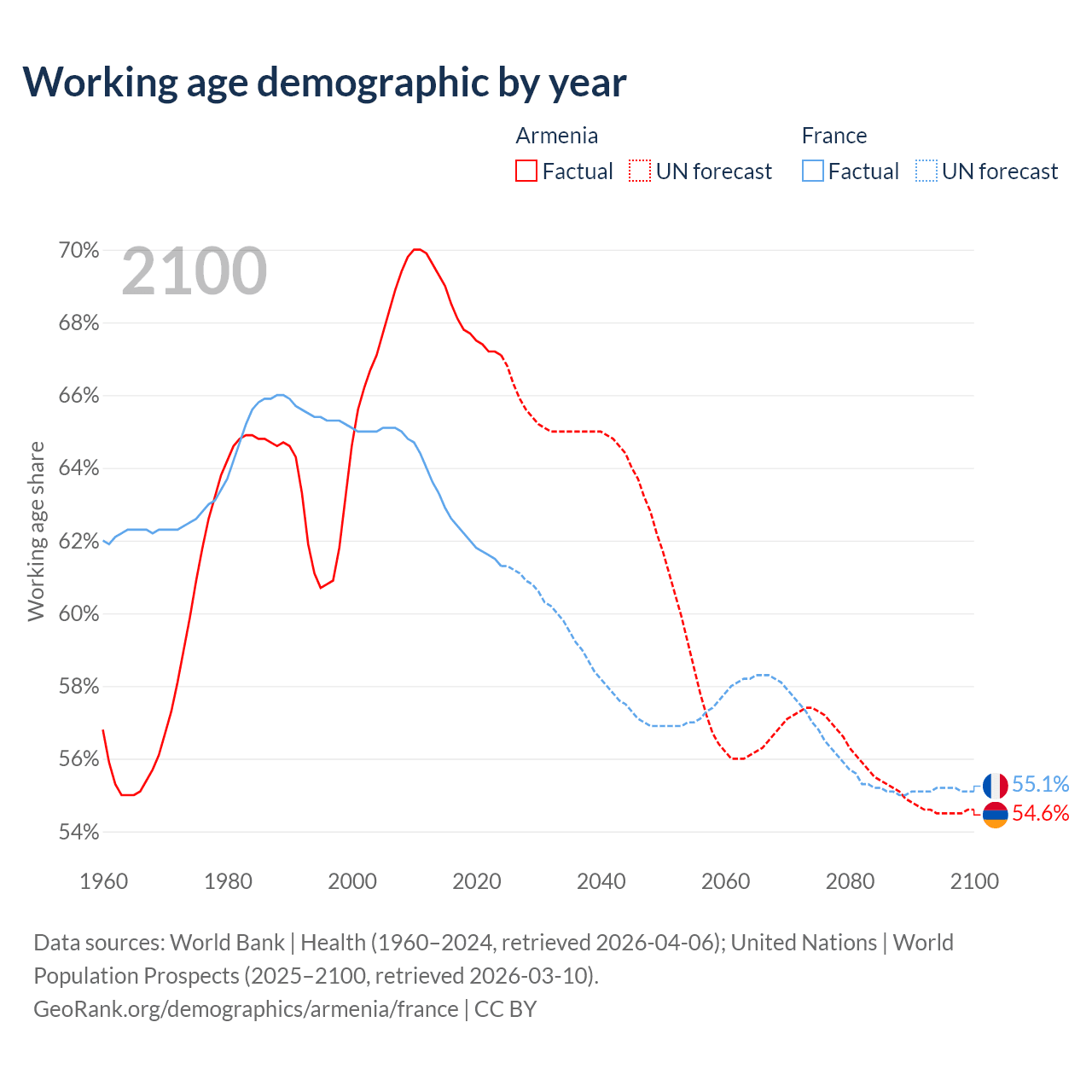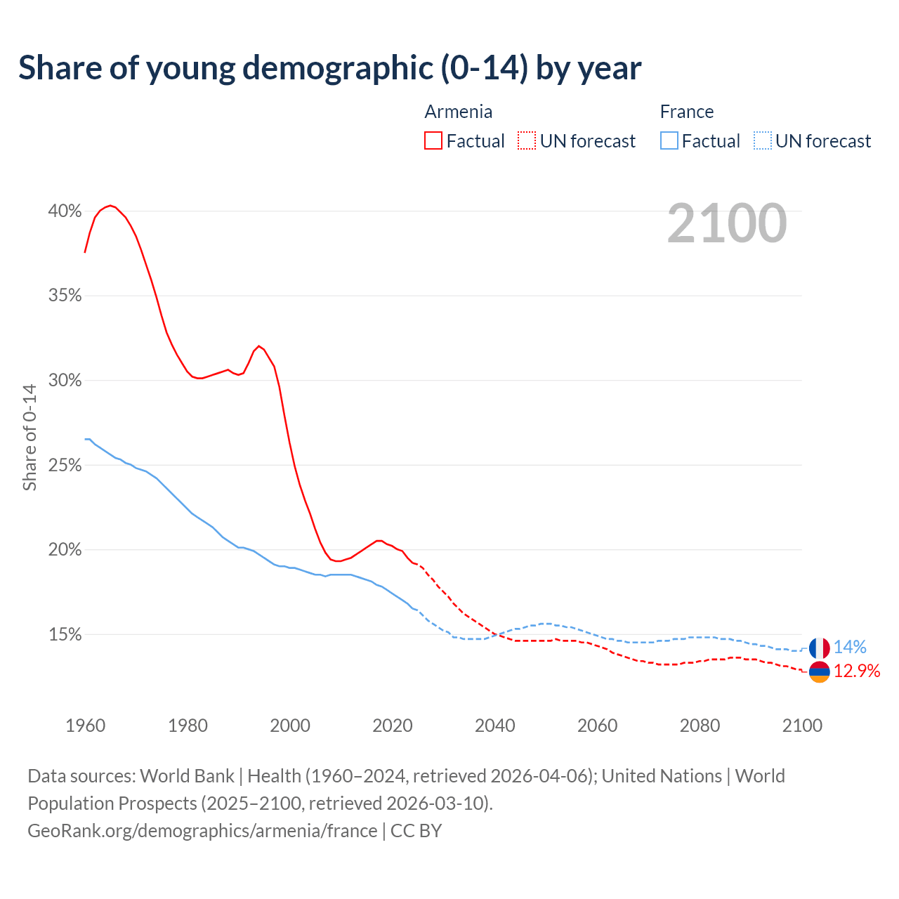 Median age Armenia vs France, 1960-2100