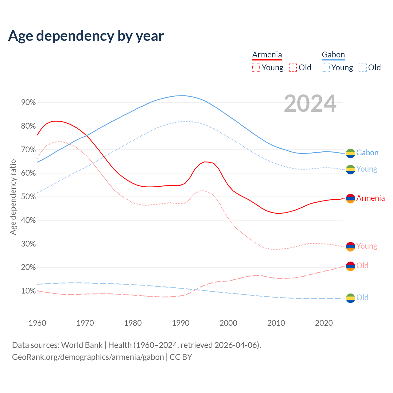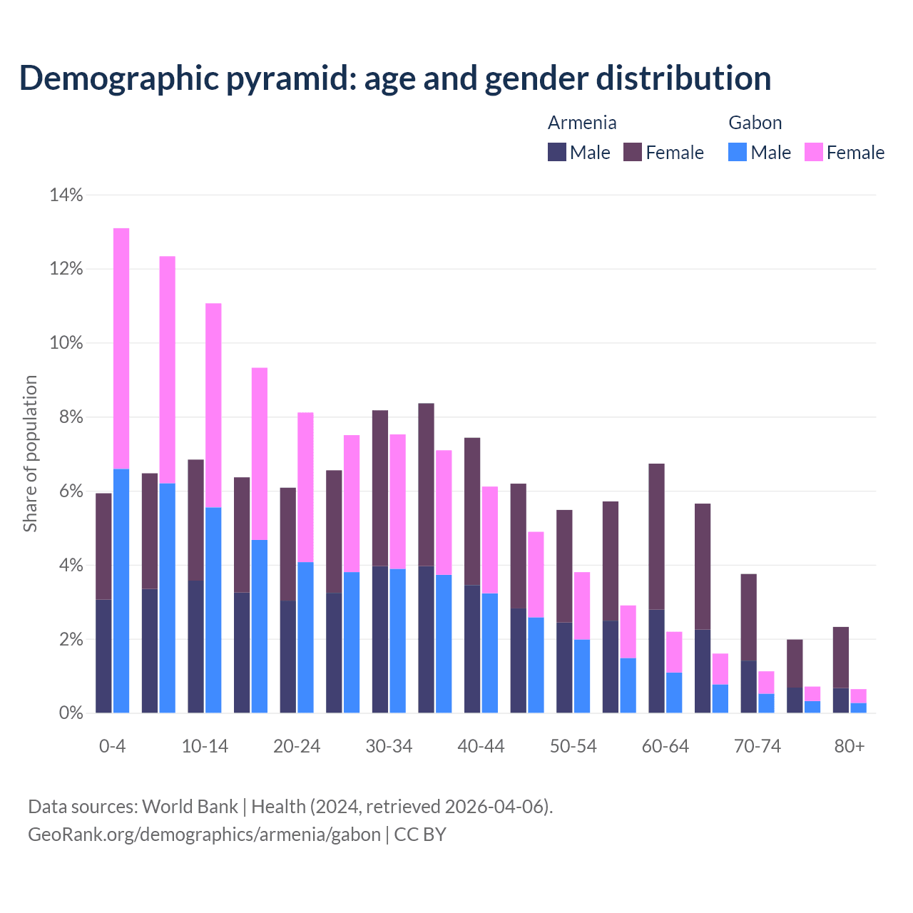 The share of older people aged 65 and over is 13.7% in Armenia and 4.08% in Gabon. Life expectancy in Armenia compared to Gabon .
