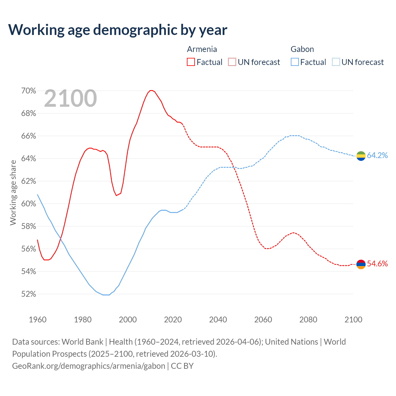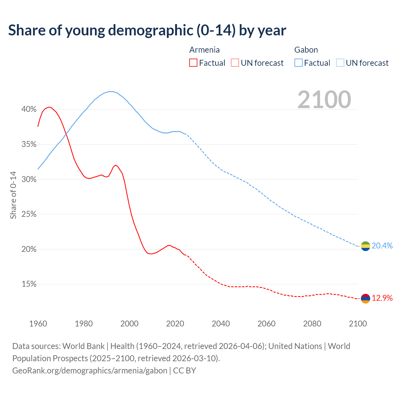 Median age Armenia vs Gabon, 1960-2100