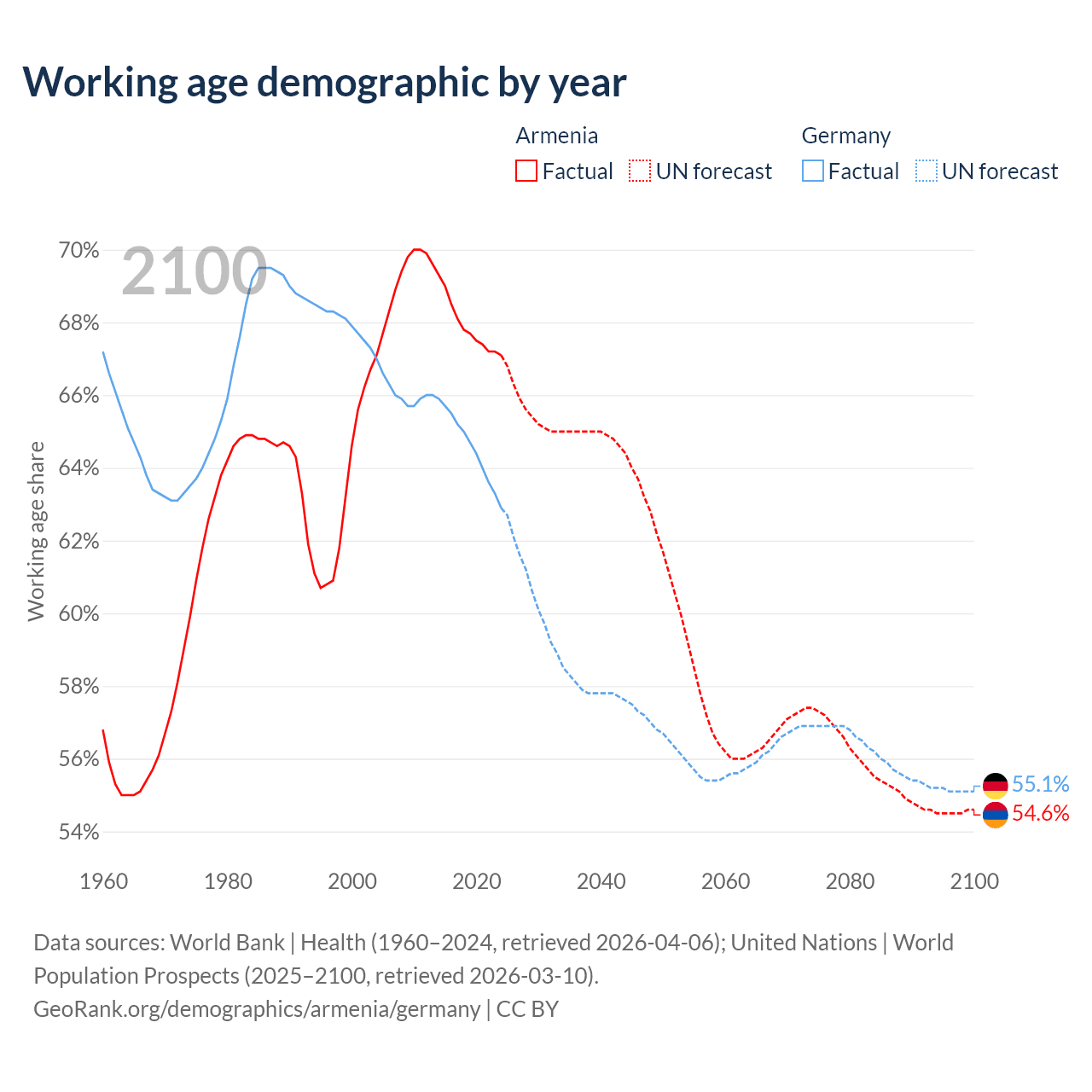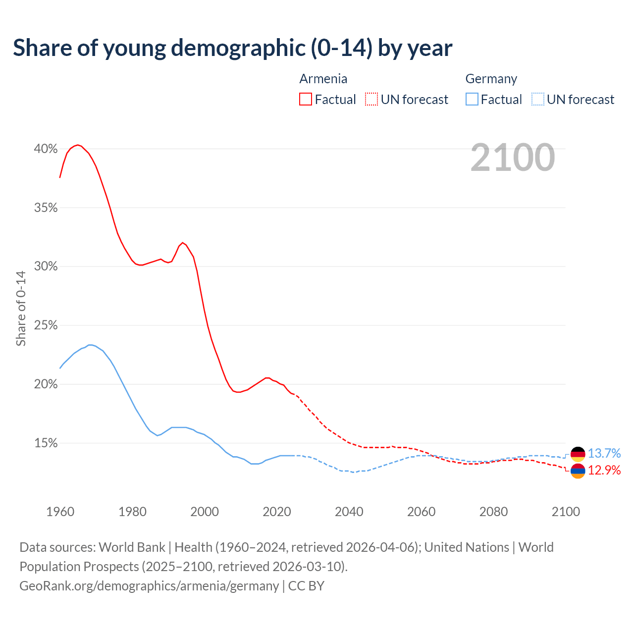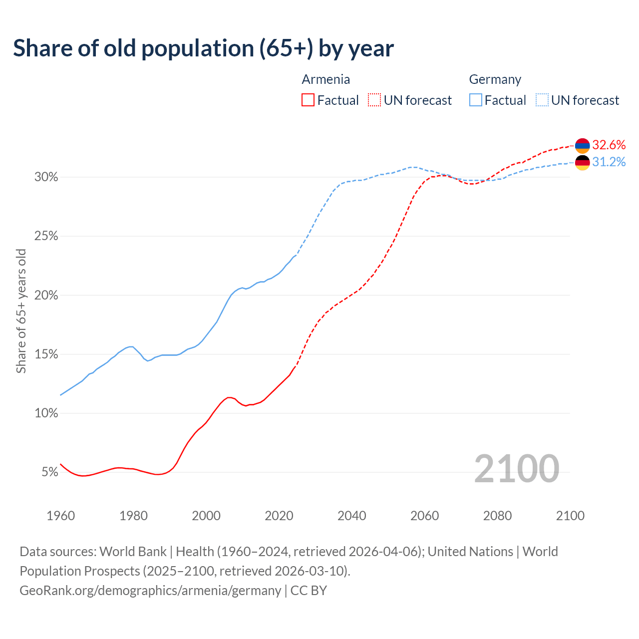 Median age Armenia vs Germany, 1960-2100