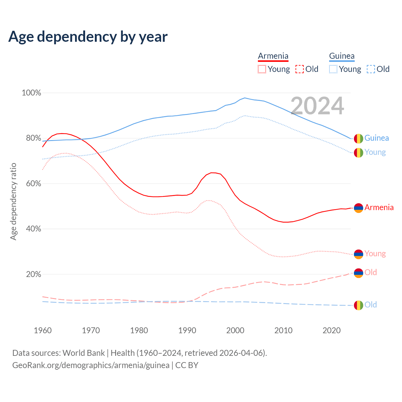 - Armenia is ranked 64/196 by median age (oldest to youngest) vs 176/196 for Guinea.