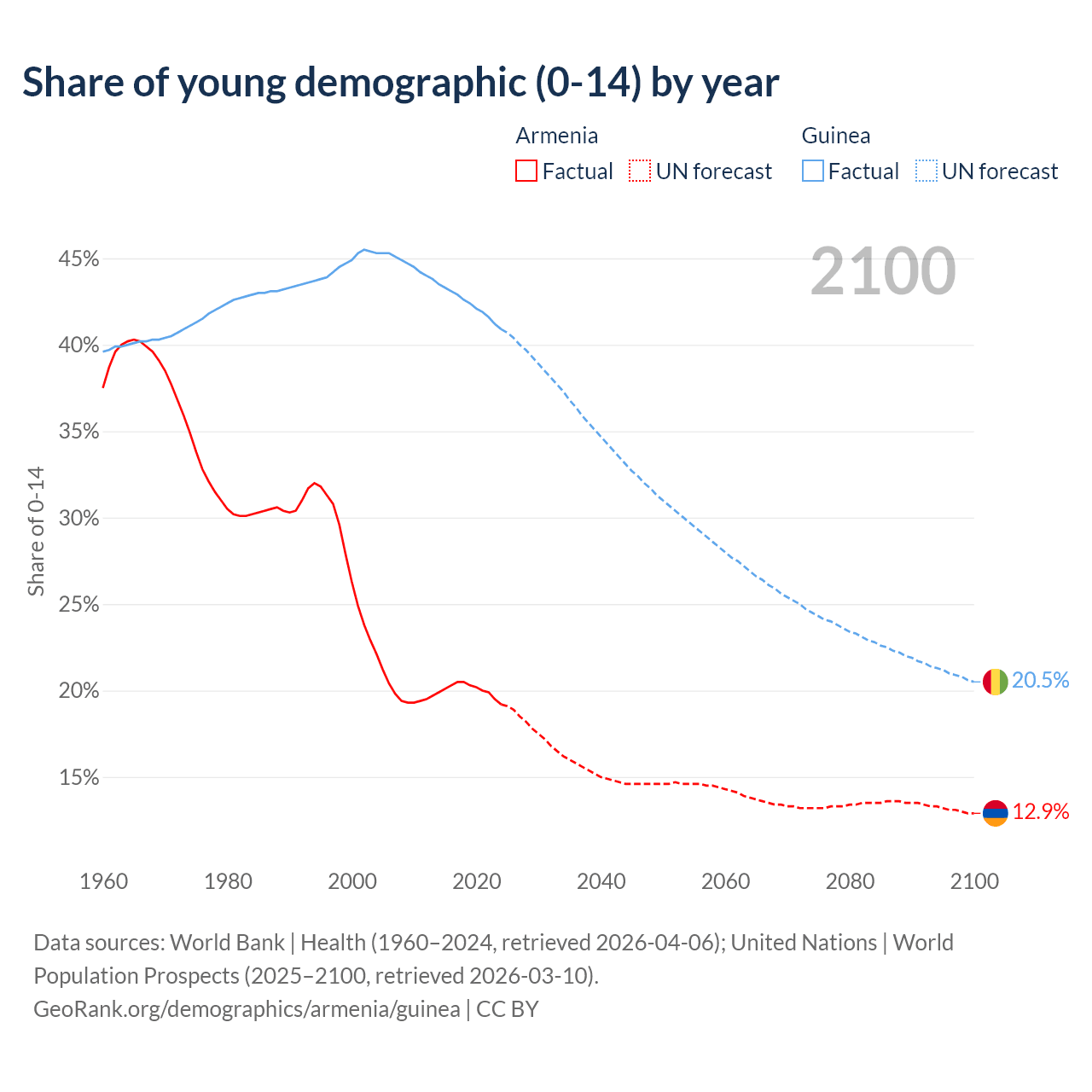 - The share of young demographic (0-15 years old) in Armenia is 19.2% vs 40.9% in Guinea.