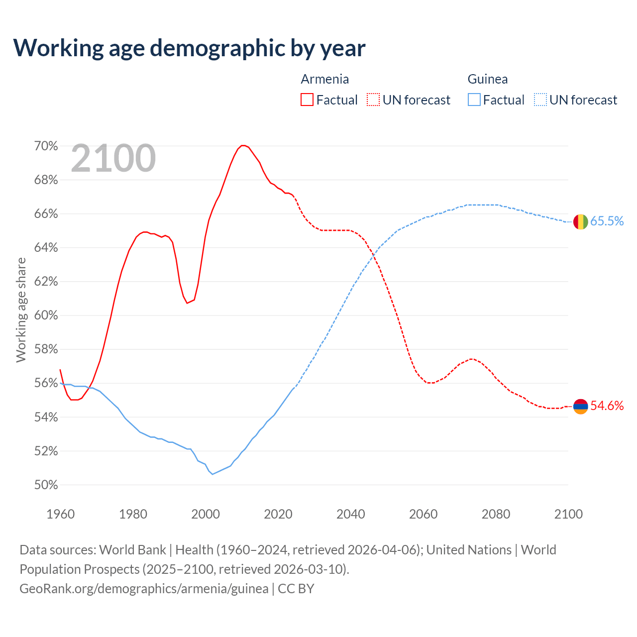 - Armenia has 2M working age adults (aged 15-64) vs 8.65M in Guinea.