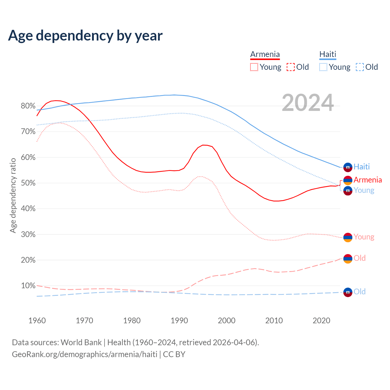 - Armenia is ranked 64/196 by median age (oldest to youngest) vs 135/196 for Haiti.