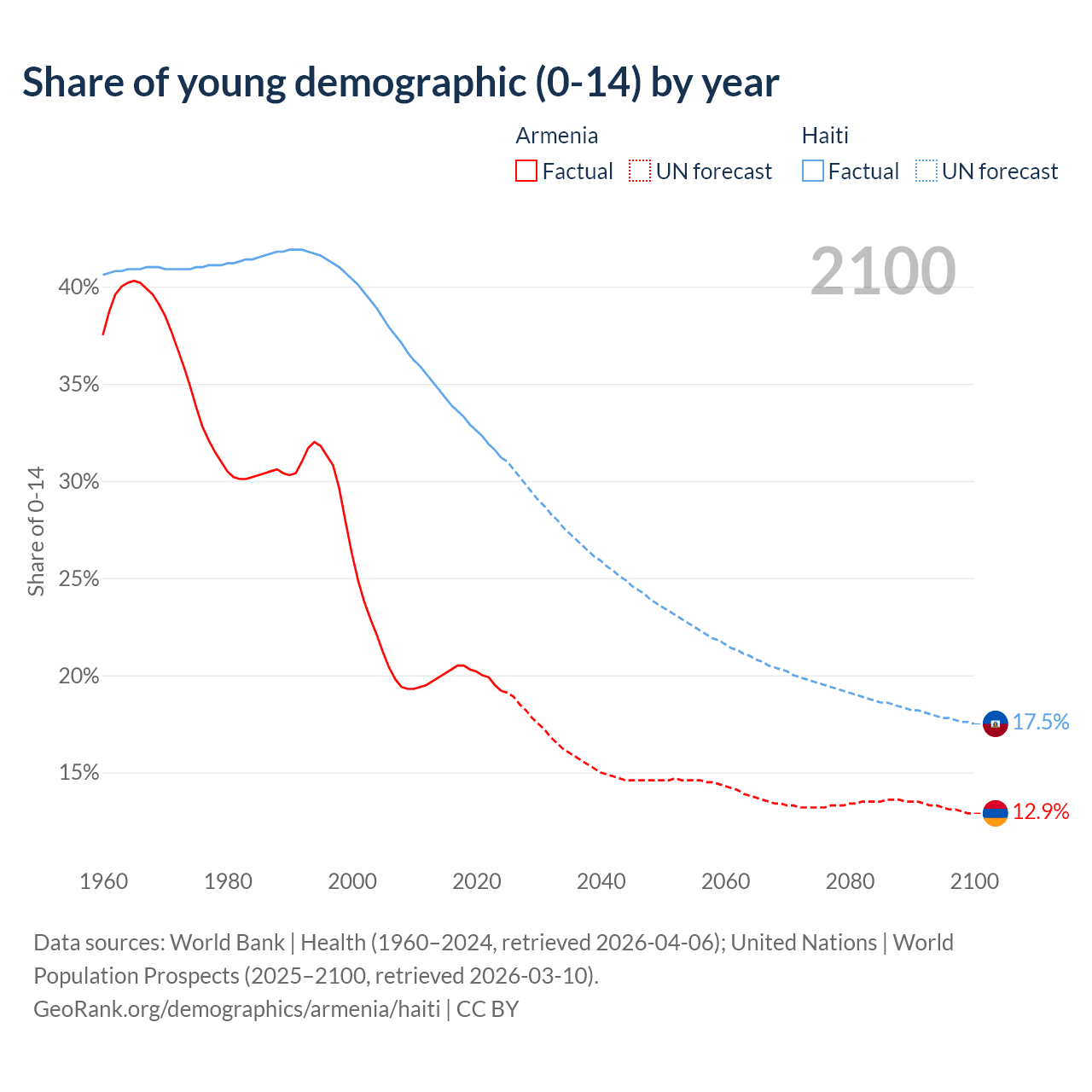 - The share of young demographic (0-15 years old) in Armenia is 19.2% vs 31.2% in Haiti.