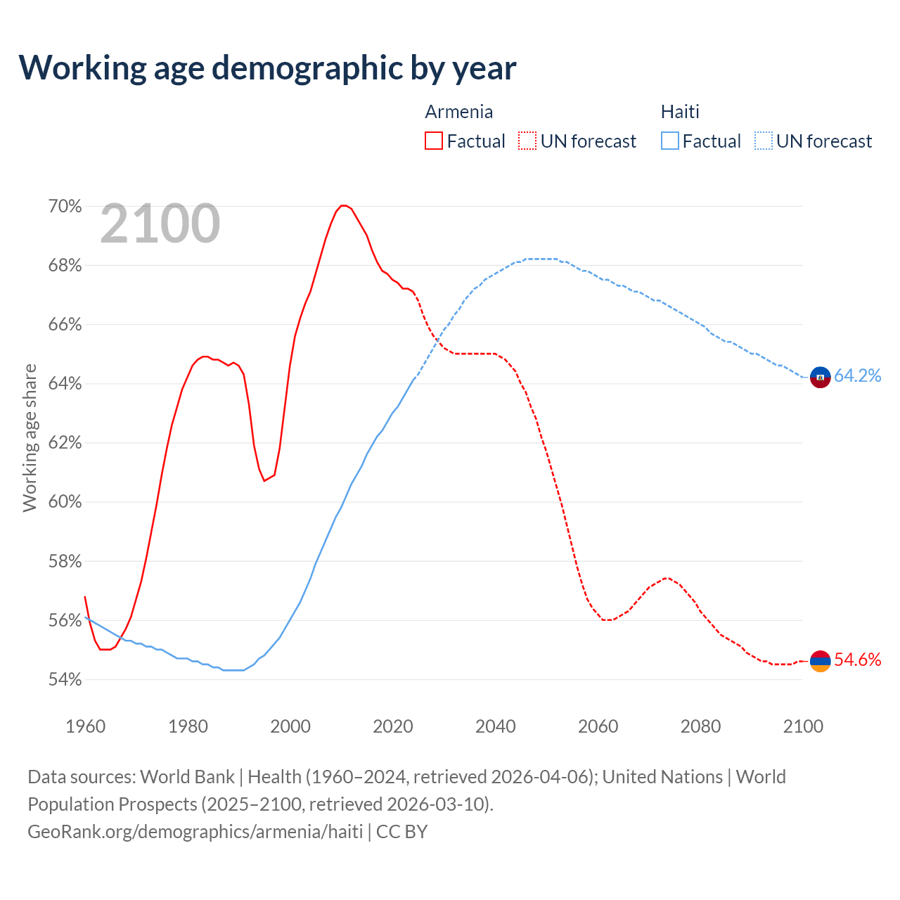 Median age Armenia vs Haiti, 1960-2100