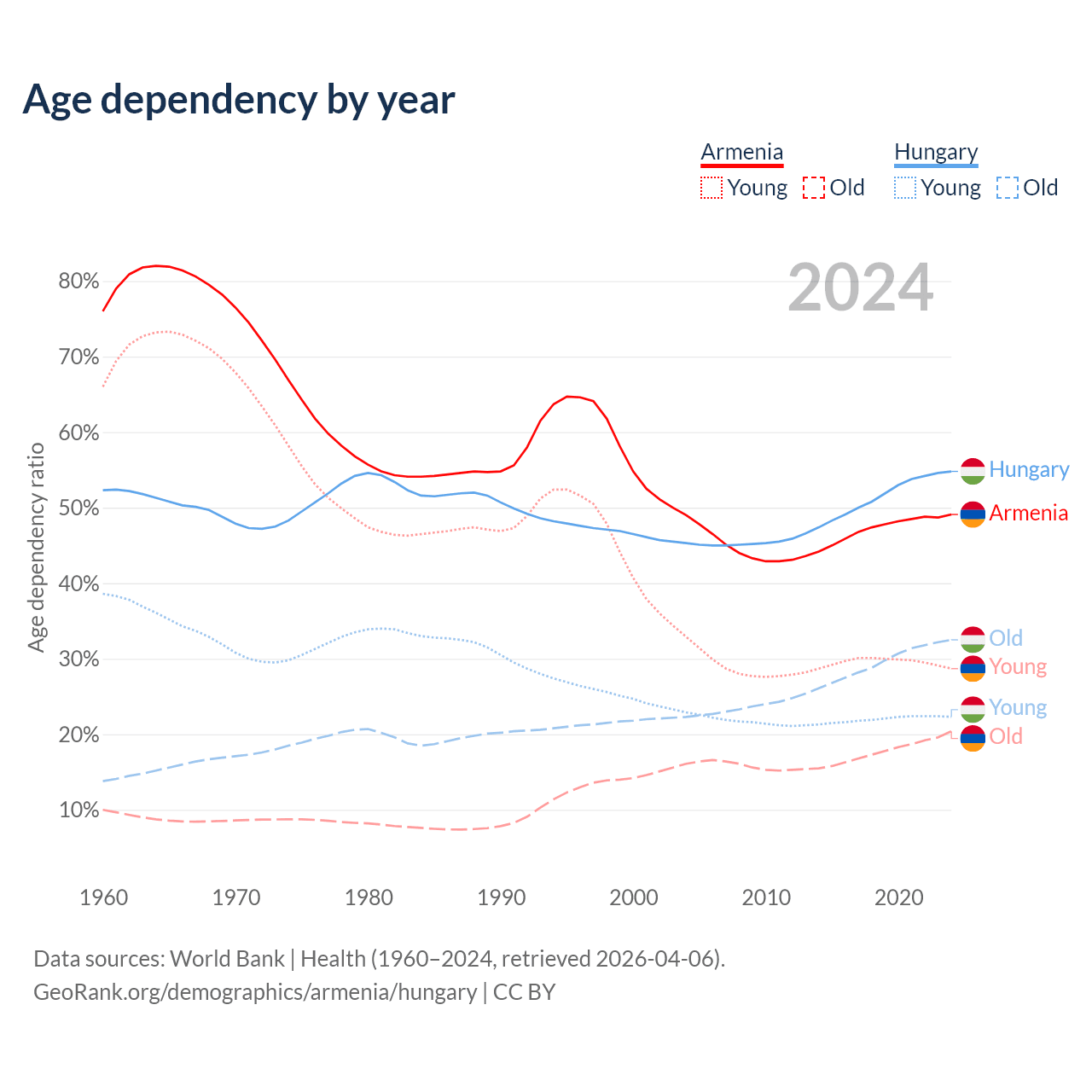 The share of older people aged 65 and over is 13.7% in Armenia and 21% in Hungary. Life expectancy in Armenia compared to Hungary .