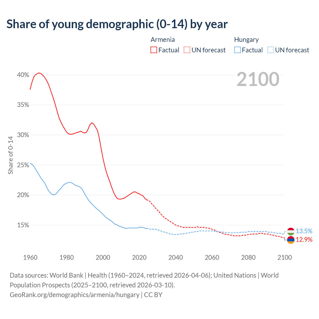 - The share of young demographic (0-15 years old) in Armenia is 19.2% vs 14.4% in Hungary.
