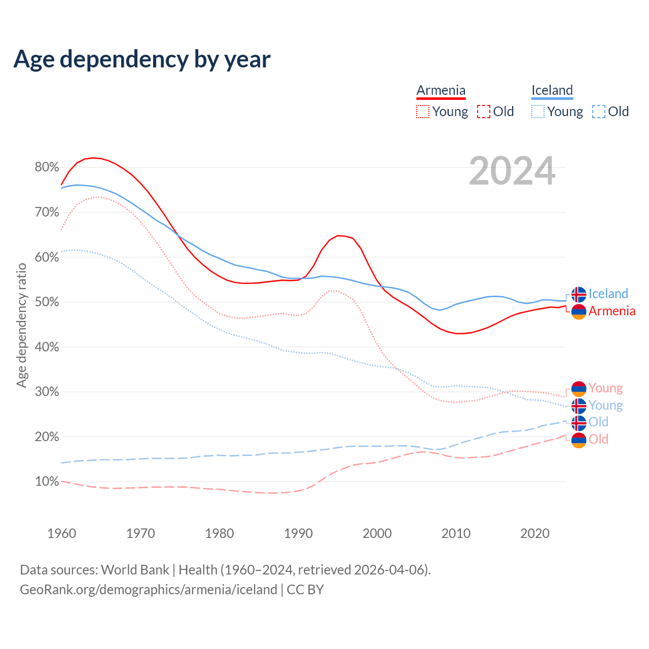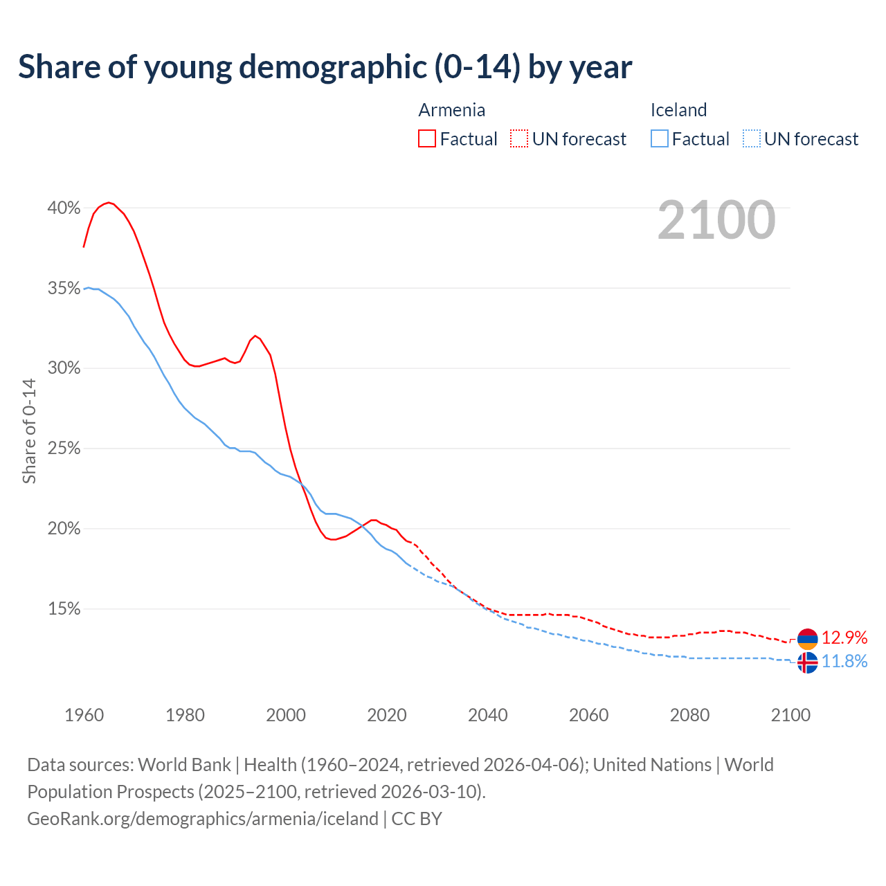 - The share of young demographic (0-15 years old) in Armenia is 19.2% vs 17.8% in Iceland.