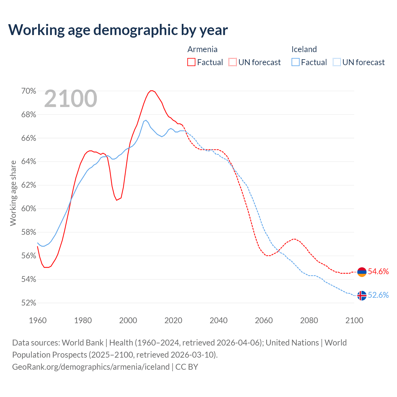 Median age Armenia vs Iceland, 1960-2100