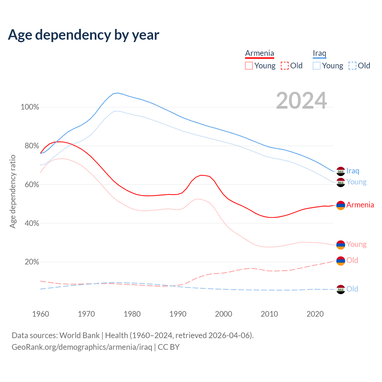 - The share of old-age demographic (65+) in Armenia is 13.7% vs 3.41% in Iraq.