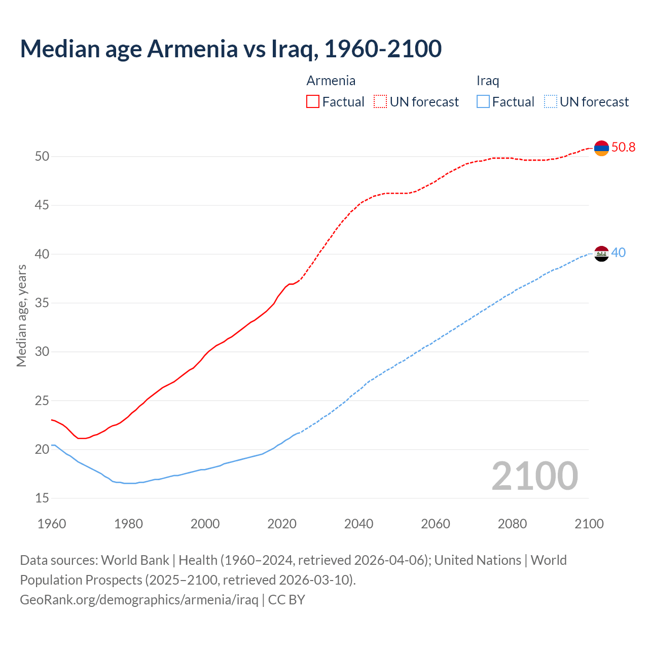 - Armenia is ranked 64/196 by median age (oldest to youngest) vs 151/196 for Iraq.