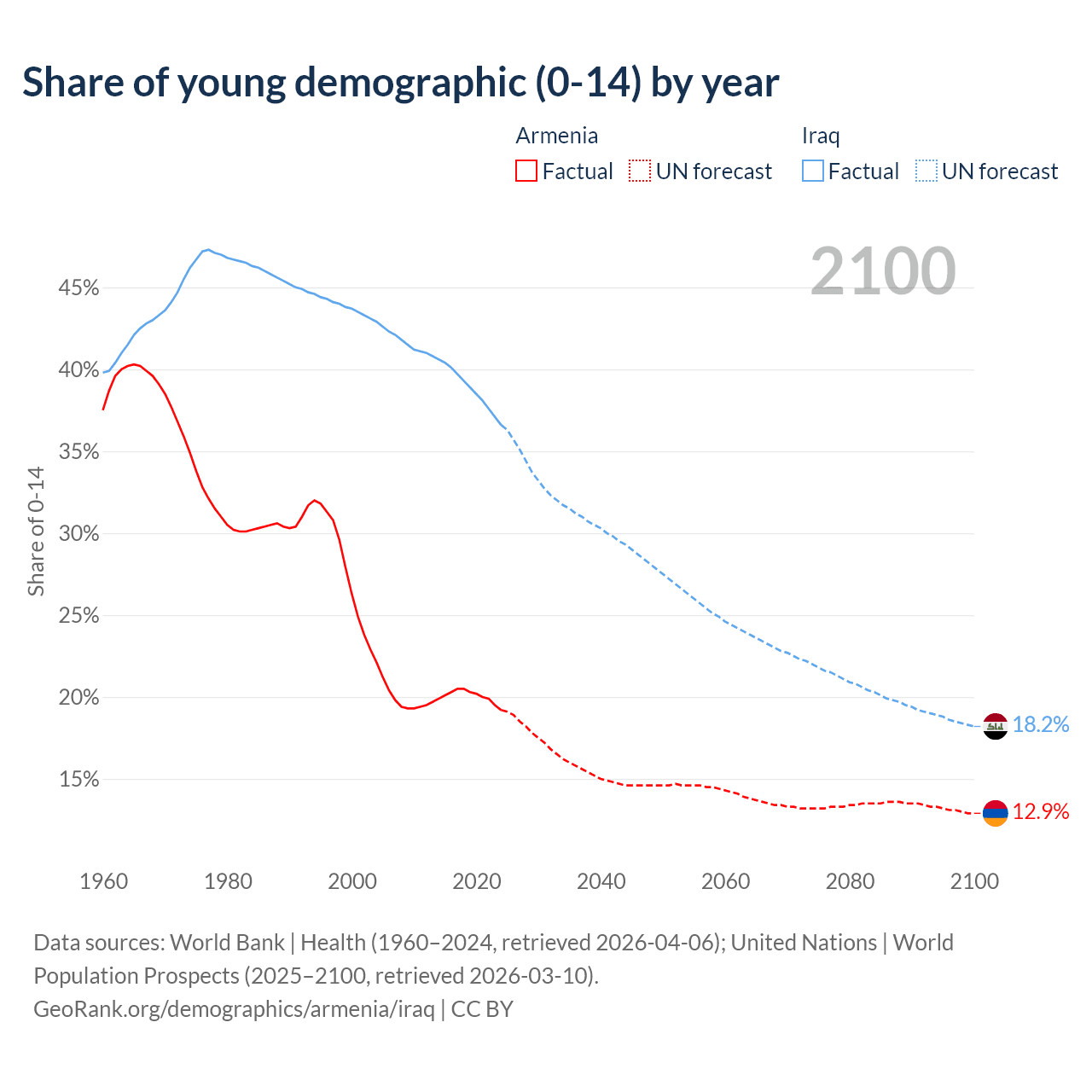 - The share of young demographic (0-15 years old) in Armenia is 19.2% vs 36.6% in Iraq.