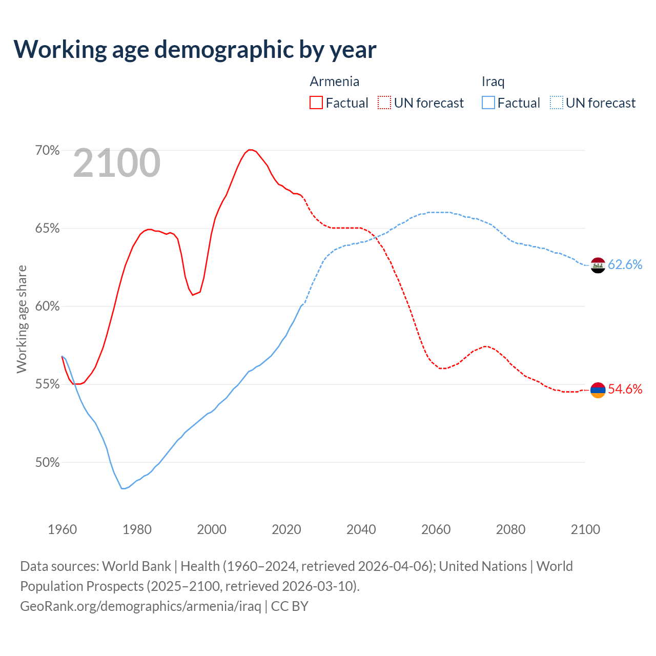 - Armenia has 2M working age adults (aged 15-64) vs 29M in Iraq.