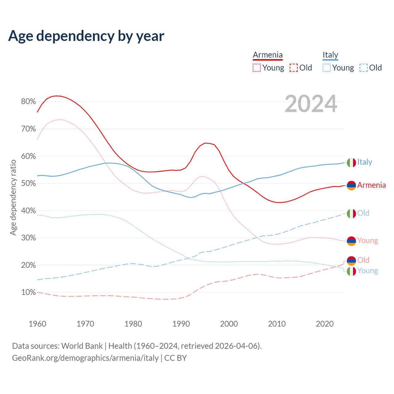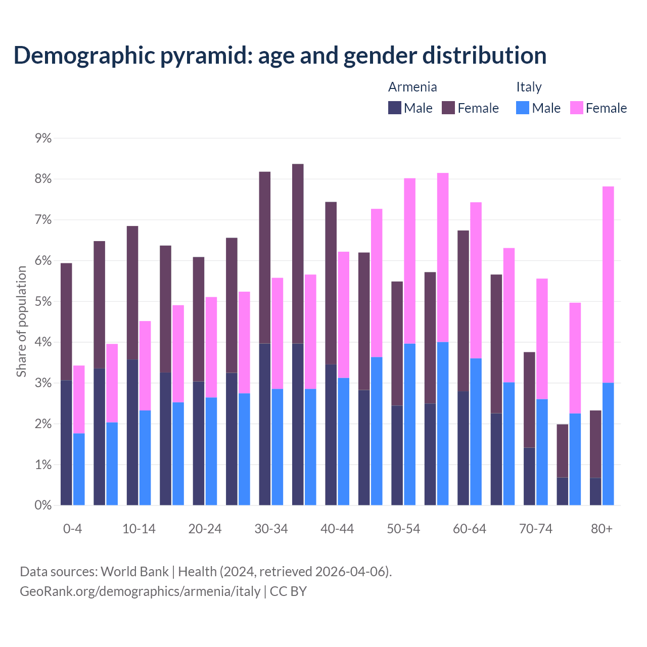 The share of older people aged 65 and over is 13.7% in Armenia and 24.6% in Italy. Life expectancy in Armenia compared to Italy .