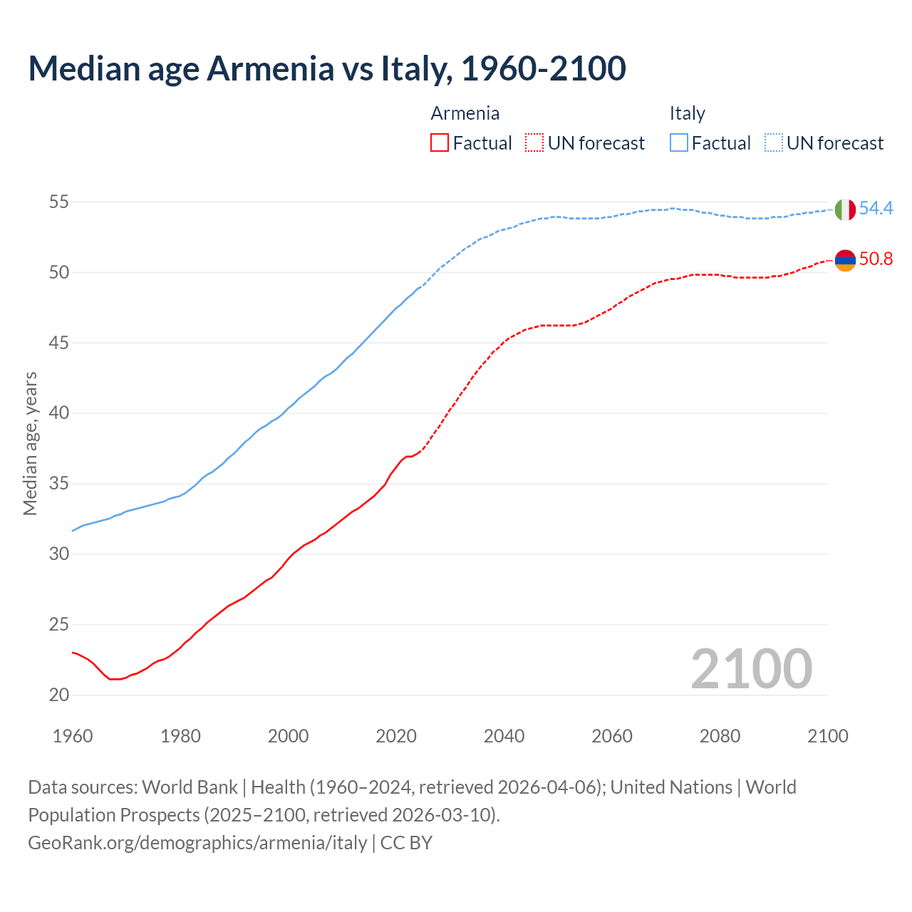 - The median age in Armenia is 37.1 years compared to 48.8 years in Italy.