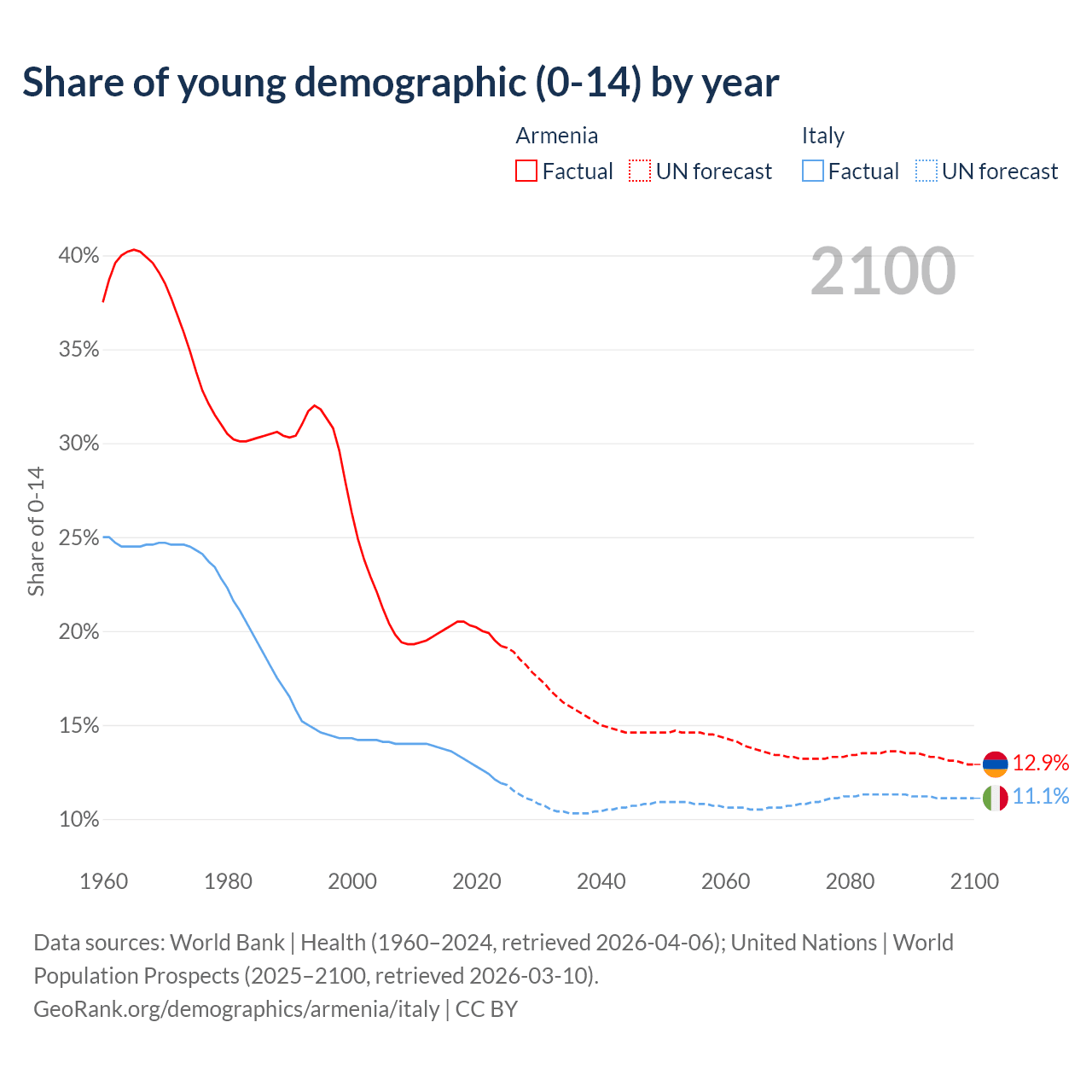 - The share of young demographic (0-15 years old) in Armenia is 19.2% vs 11.9% in Italy.
