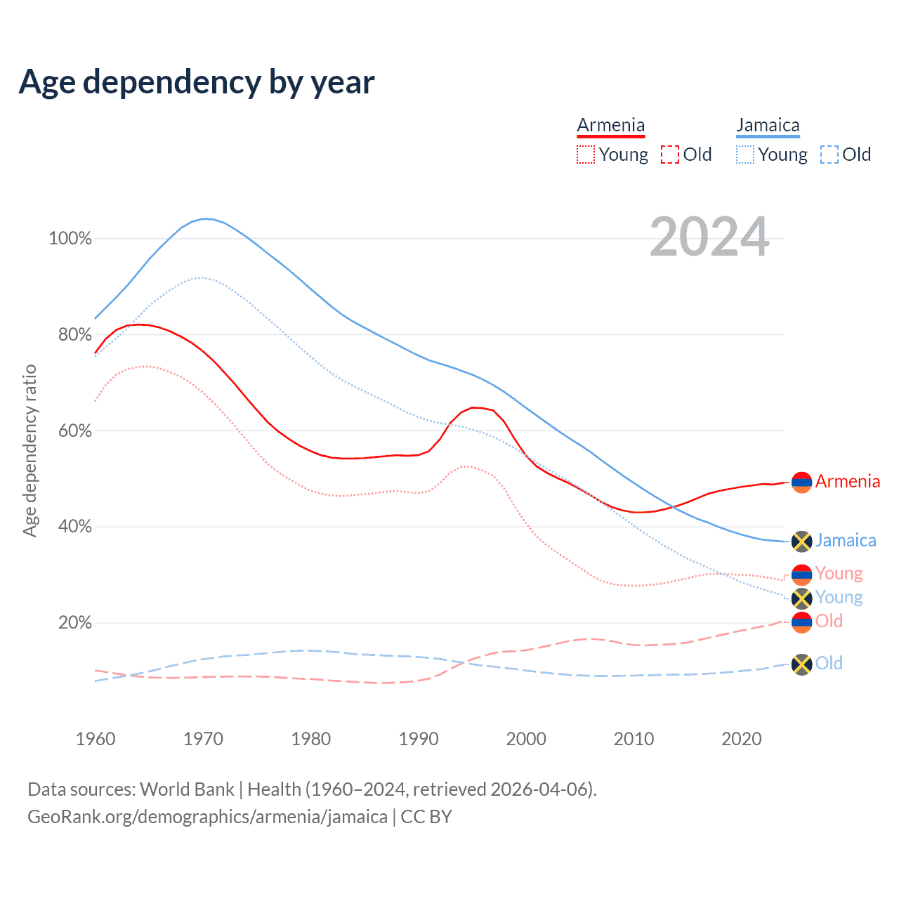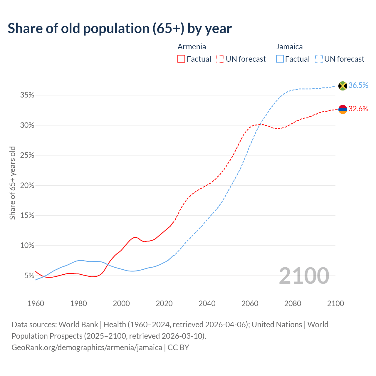 The share of older people aged 65 and over is 13.7% in Armenia and 8.21% in Jamaica. Life expectancy in Armenia compared to Jamaica .