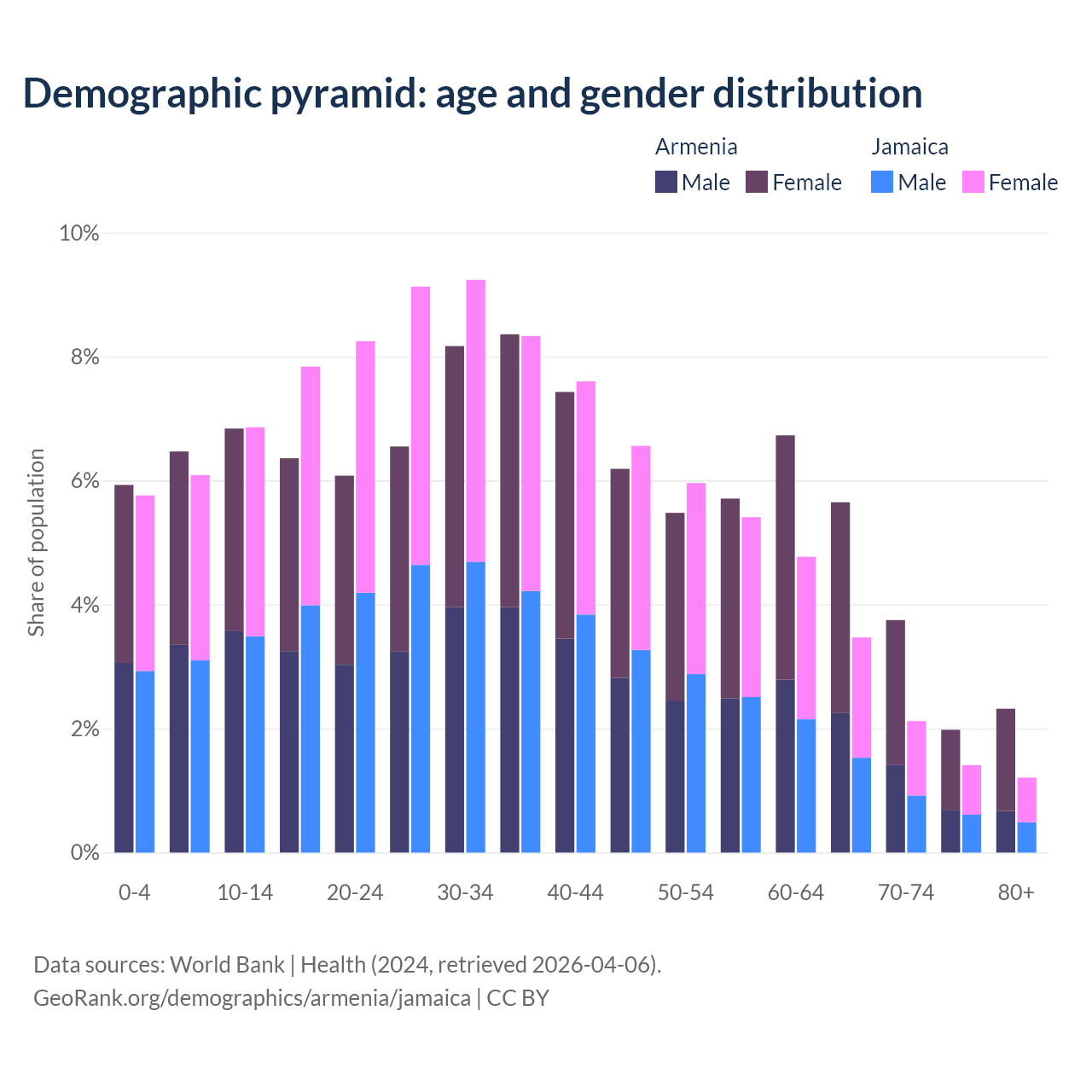 - Armenia is ranked 64/196 by median age (oldest to youngest) vs 87/196 for Jamaica.
