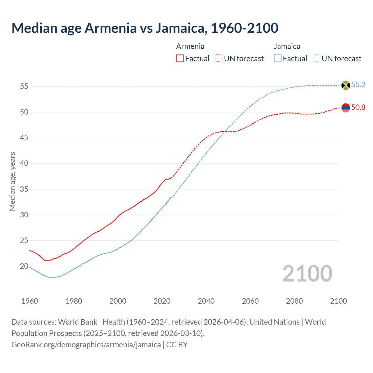 - The median age in Armenia is 37.1 years compared to 33.3 years in Jamaica.