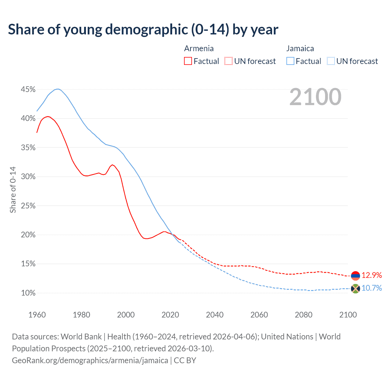 - The share of young demographic (0-15 years old) in Armenia is 19.2% vs 18.7% in Jamaica.