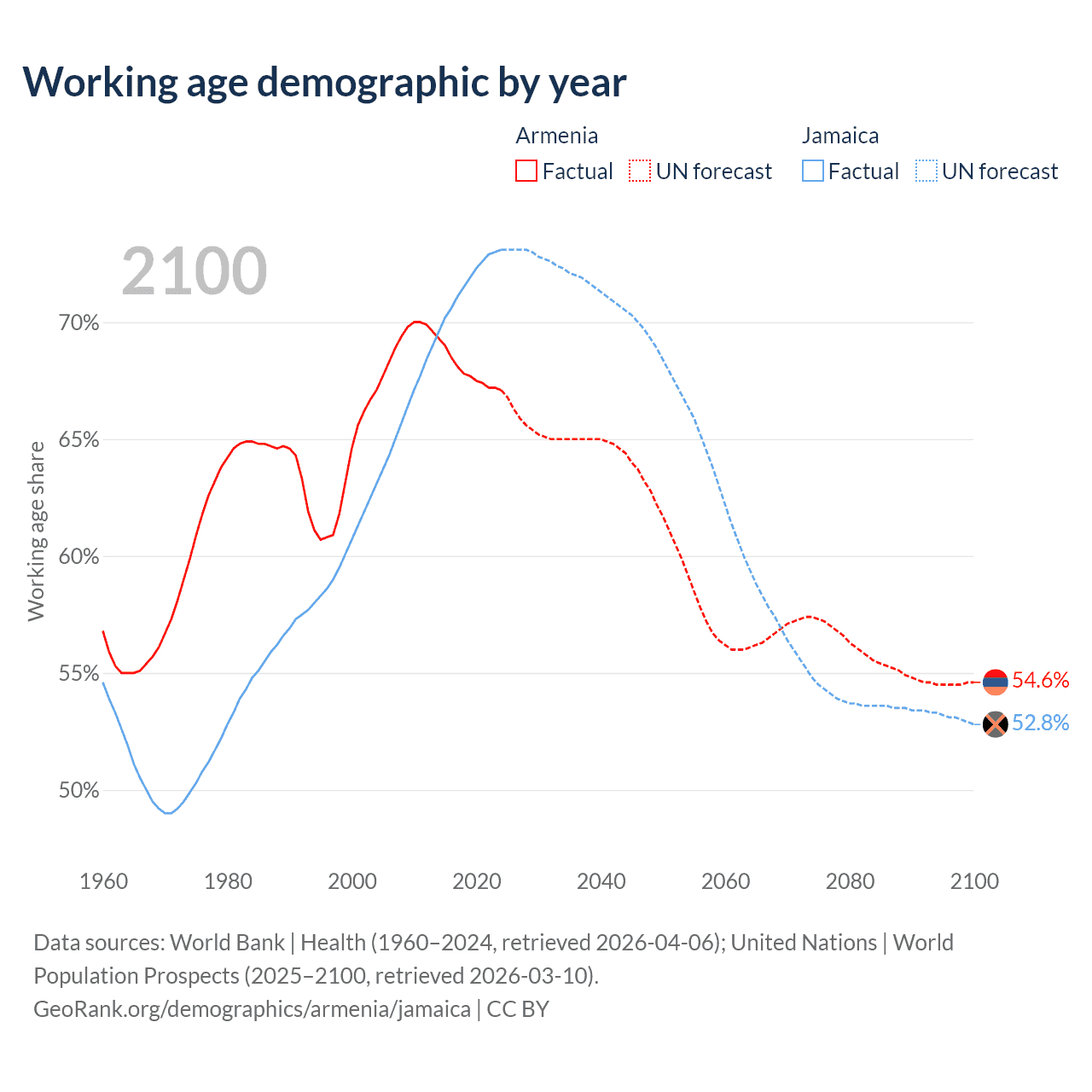 - Armenia has 2M working age adults (aged 15-64) vs 2.07M in Jamaica.