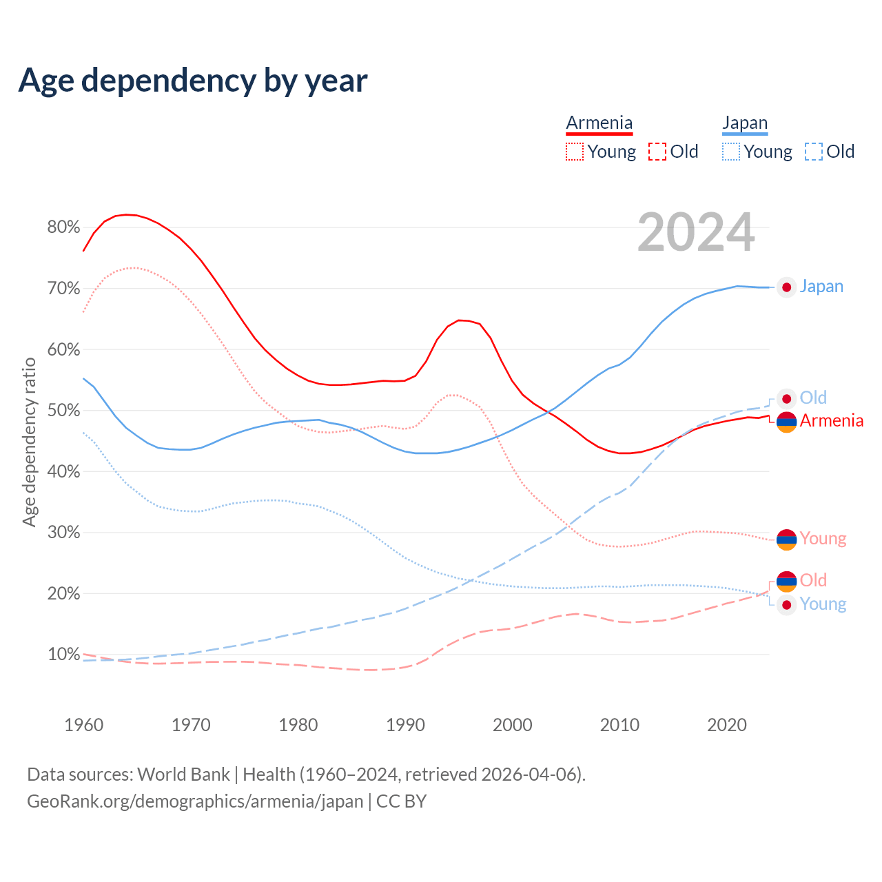 - Armenia is ranked 64/196 by median age (oldest to youngest) vs 2/196 for Japan.