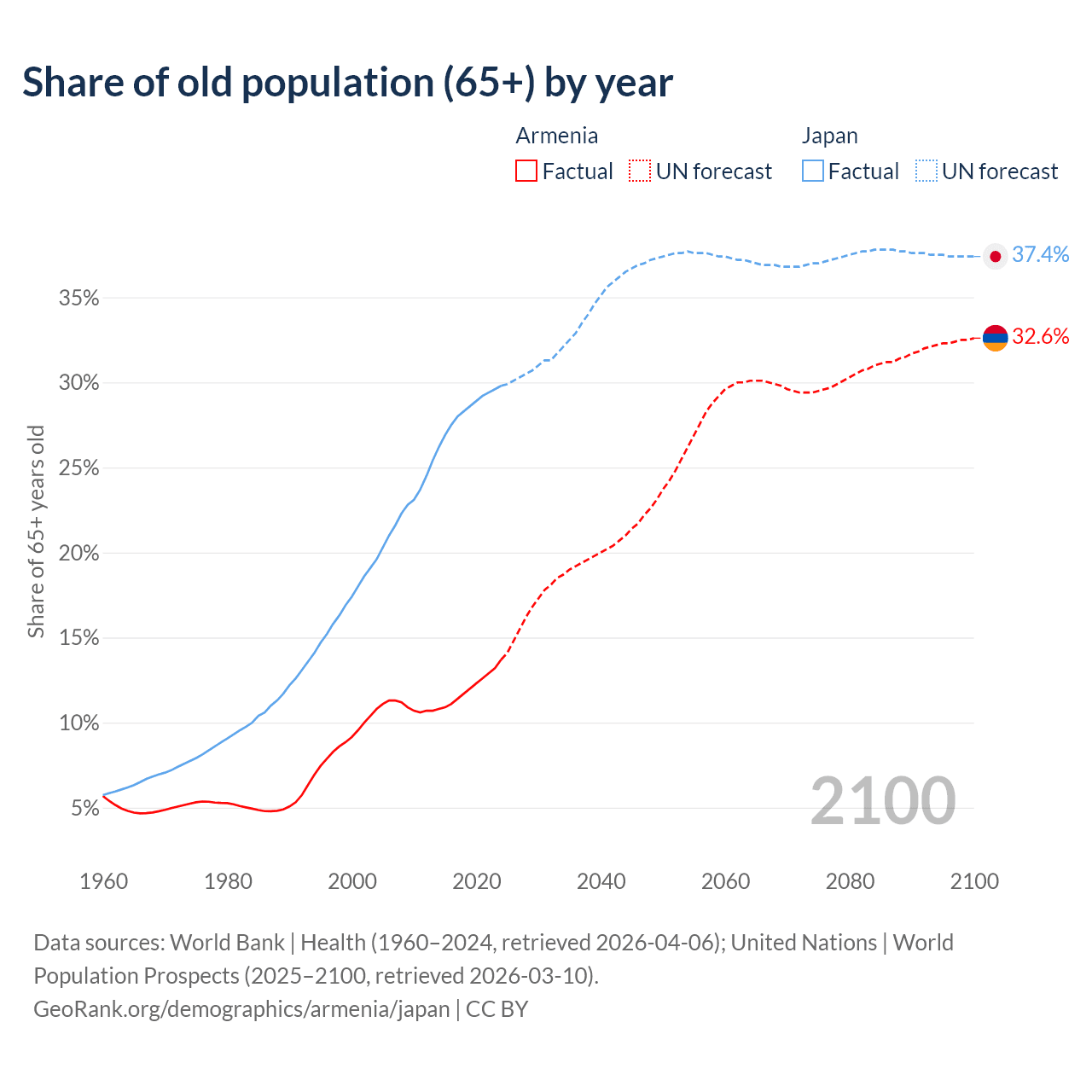 The share of older people aged 65 and over is 13.7% in Armenia and 29.8% in Japan. Life expectancy in Armenia compared to Japan .