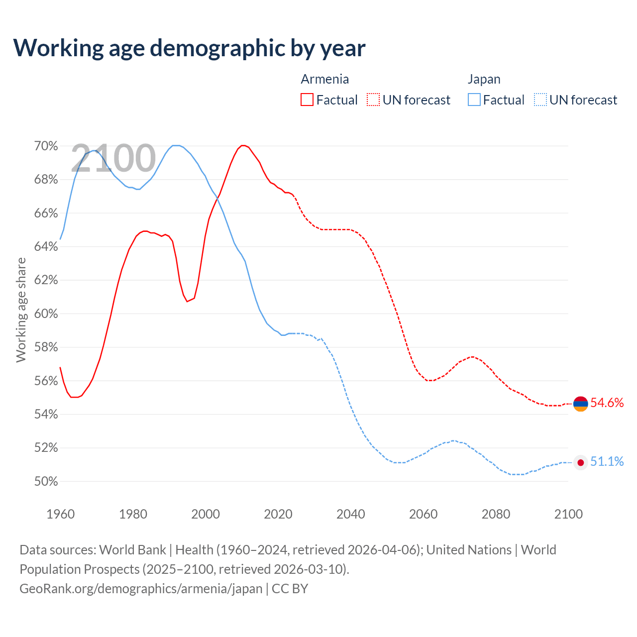 Median age Armenia vs Japan, 1960-2100