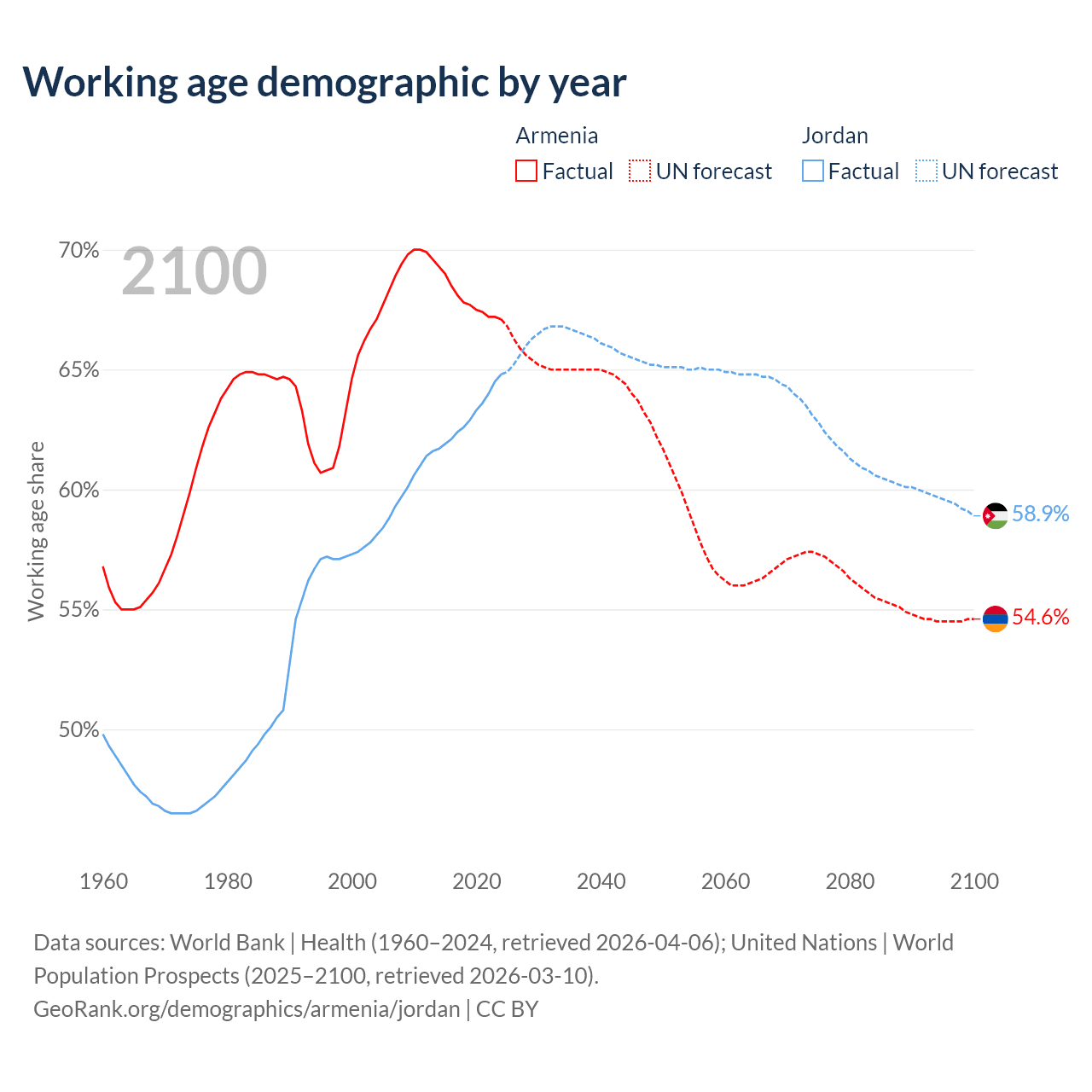Median age Armenia vs Jordan, 1960-2100