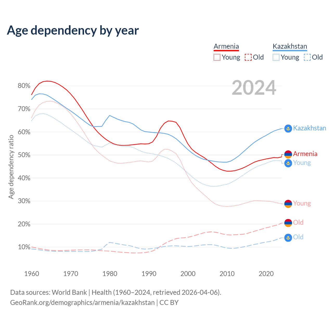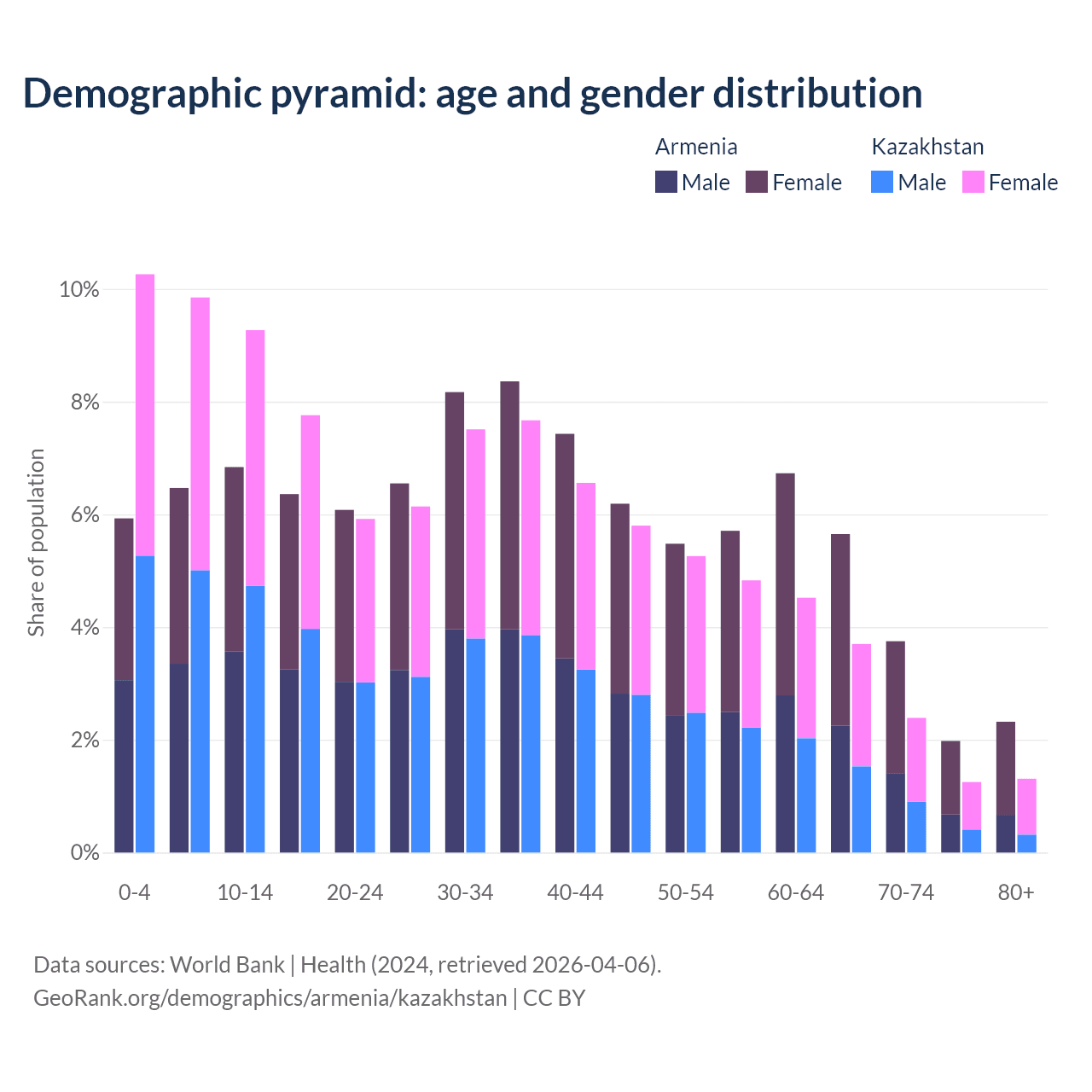 - Armenia is ranked 64/196 by median age (oldest to youngest) vs 99/196 for Kazakhstan.