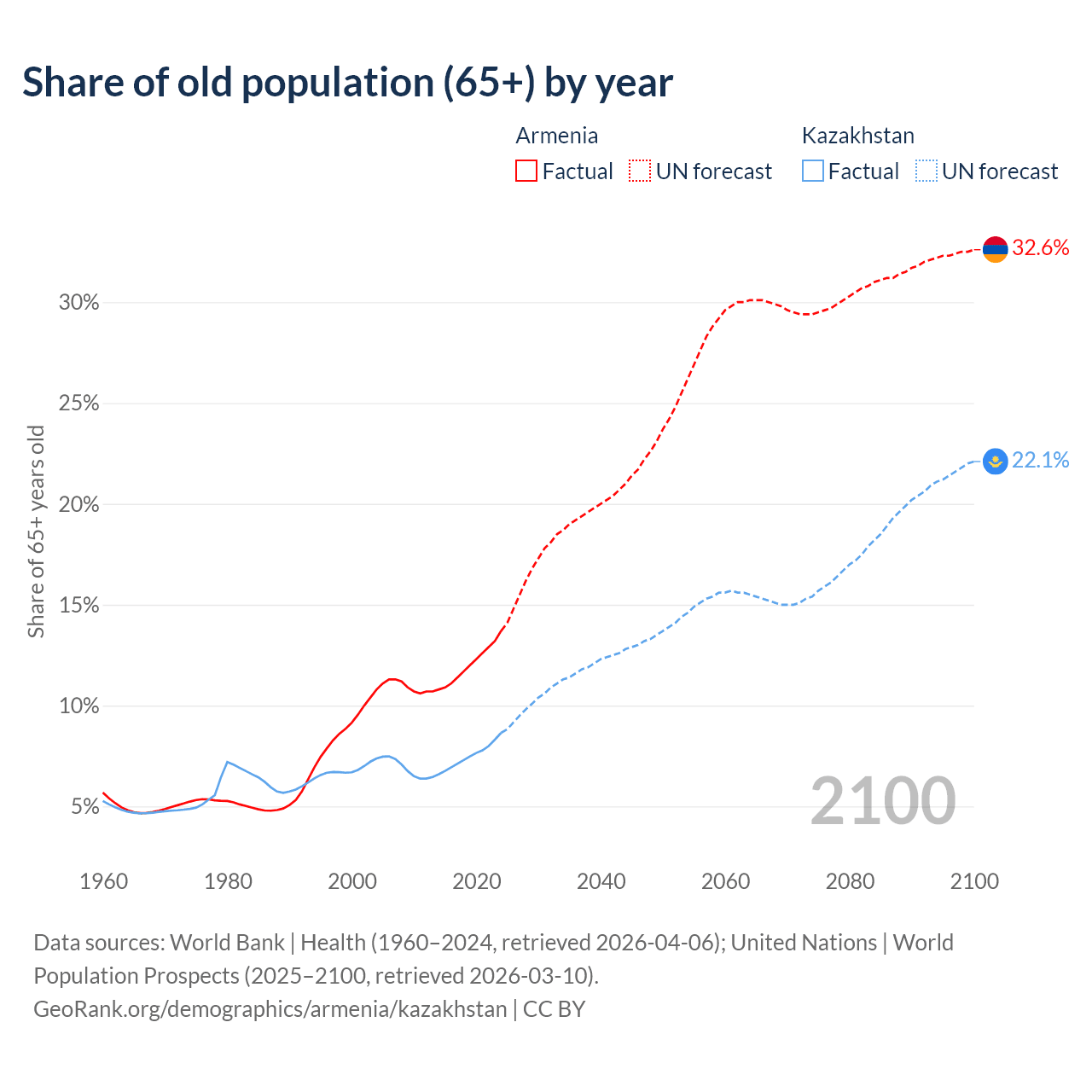 The share of older people aged 65 and over is 13.7% in Armenia and 8.65% in Kazakhstan. Life expectancy in Armenia compared to Kazakhstan .