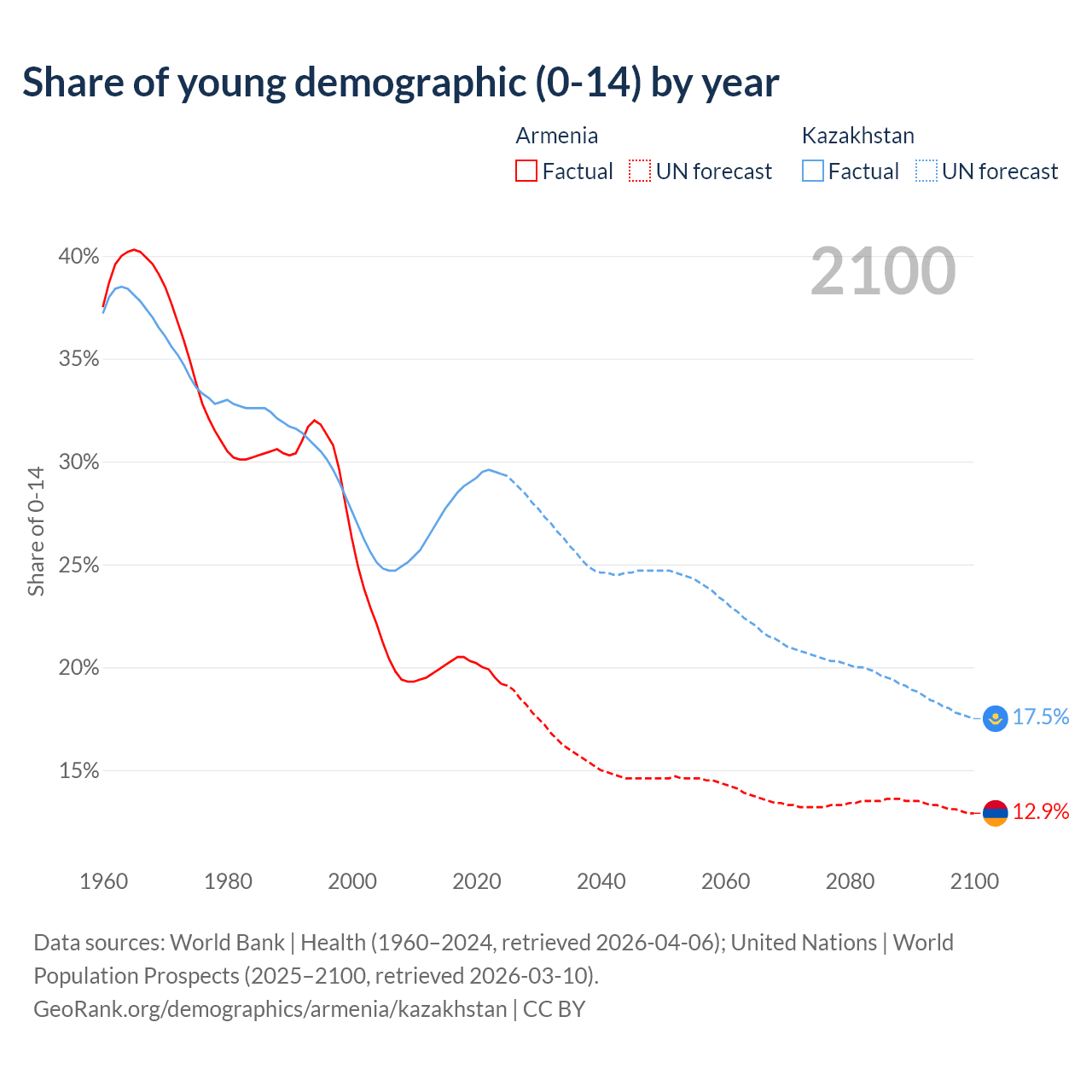 - The share of young demographic (0-15 years old) in Armenia is 19.2% vs 29.4% in Kazakhstan.