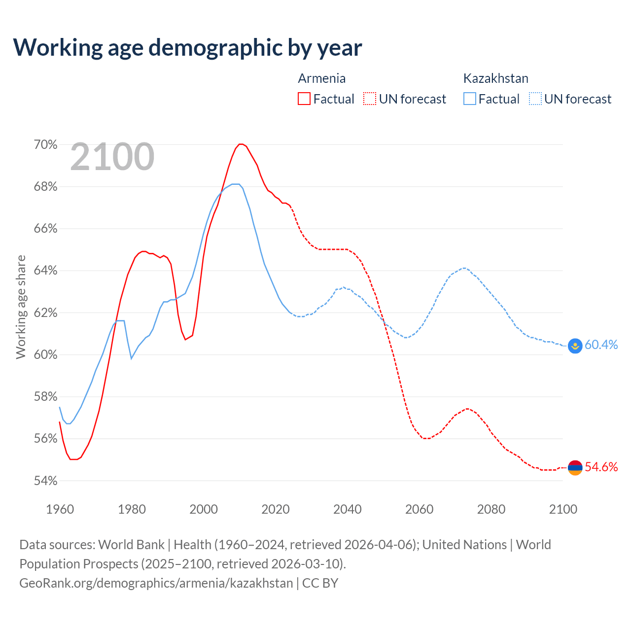 - Armenia has 2M working age adults (aged 15-64) vs 13.1M in Kazakhstan.
