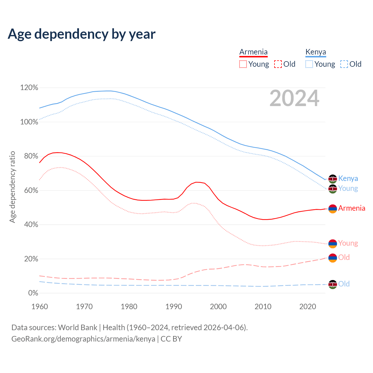 The share of older people aged 65 and over is 13.7% in Armenia and 2.97% in Kenya. Life expectancy in Armenia compared to Kenya .
