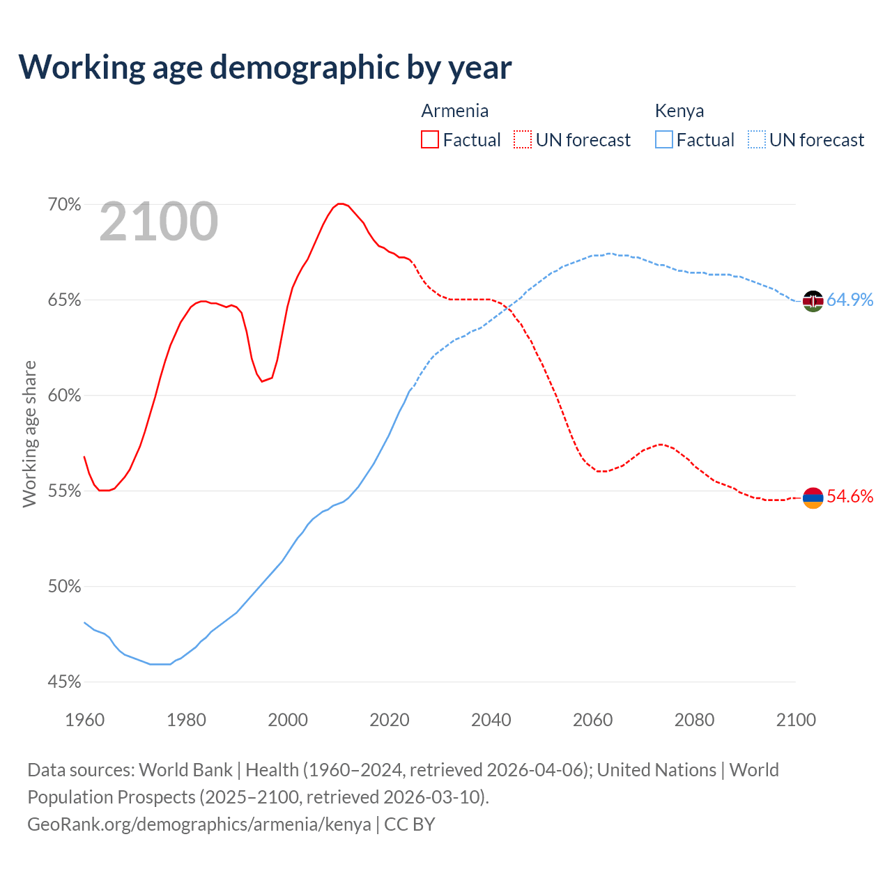 Median age Armenia vs Kenya, 1960-2100