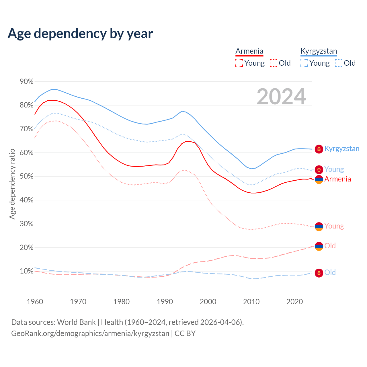 - Armenia is ranked 64/196 by median age (oldest to youngest) vs 126/196 for Kyrgyzstan.