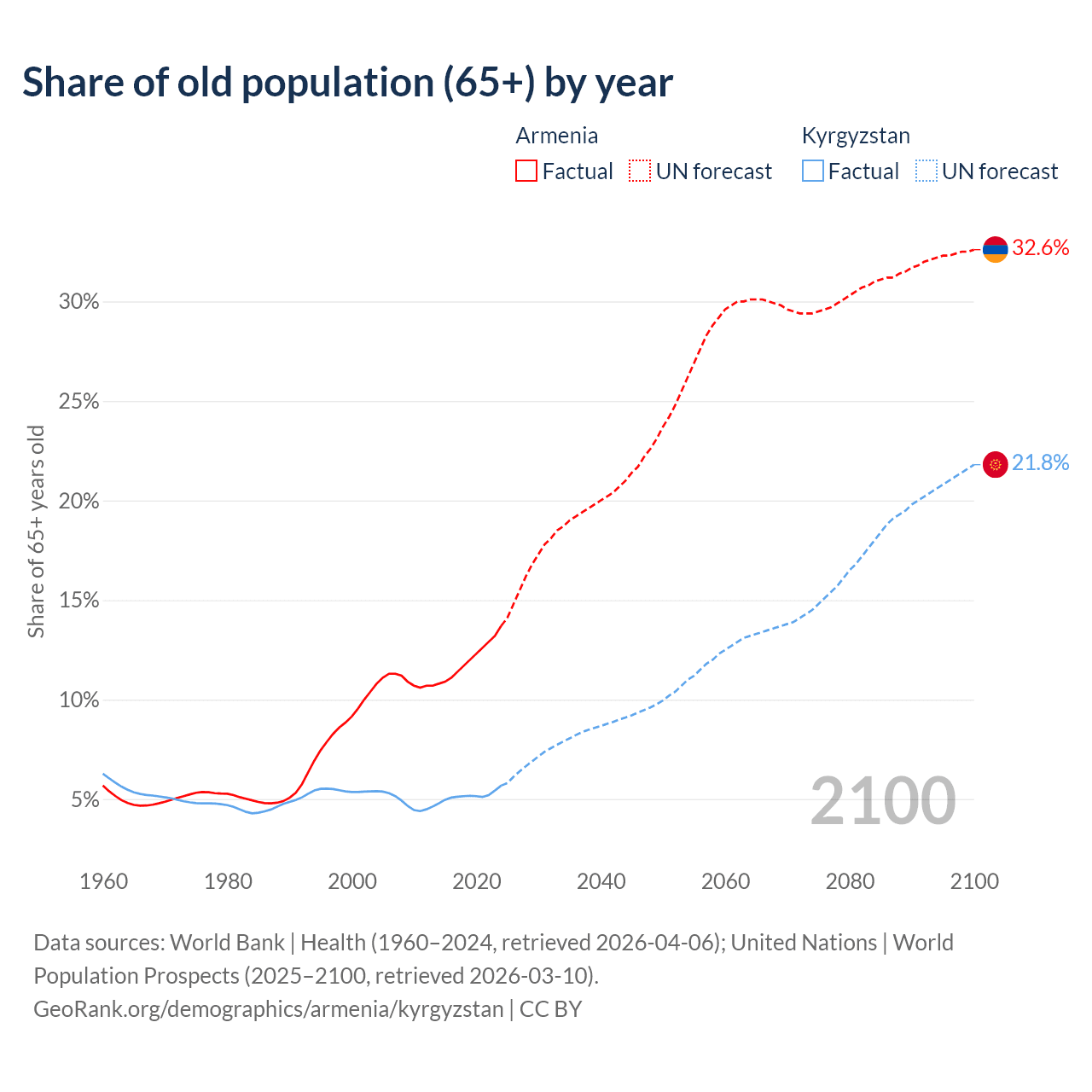 - The share of old-age demographic (65+) in Armenia is 13.7% vs 5.68% in Kyrgyzstan.