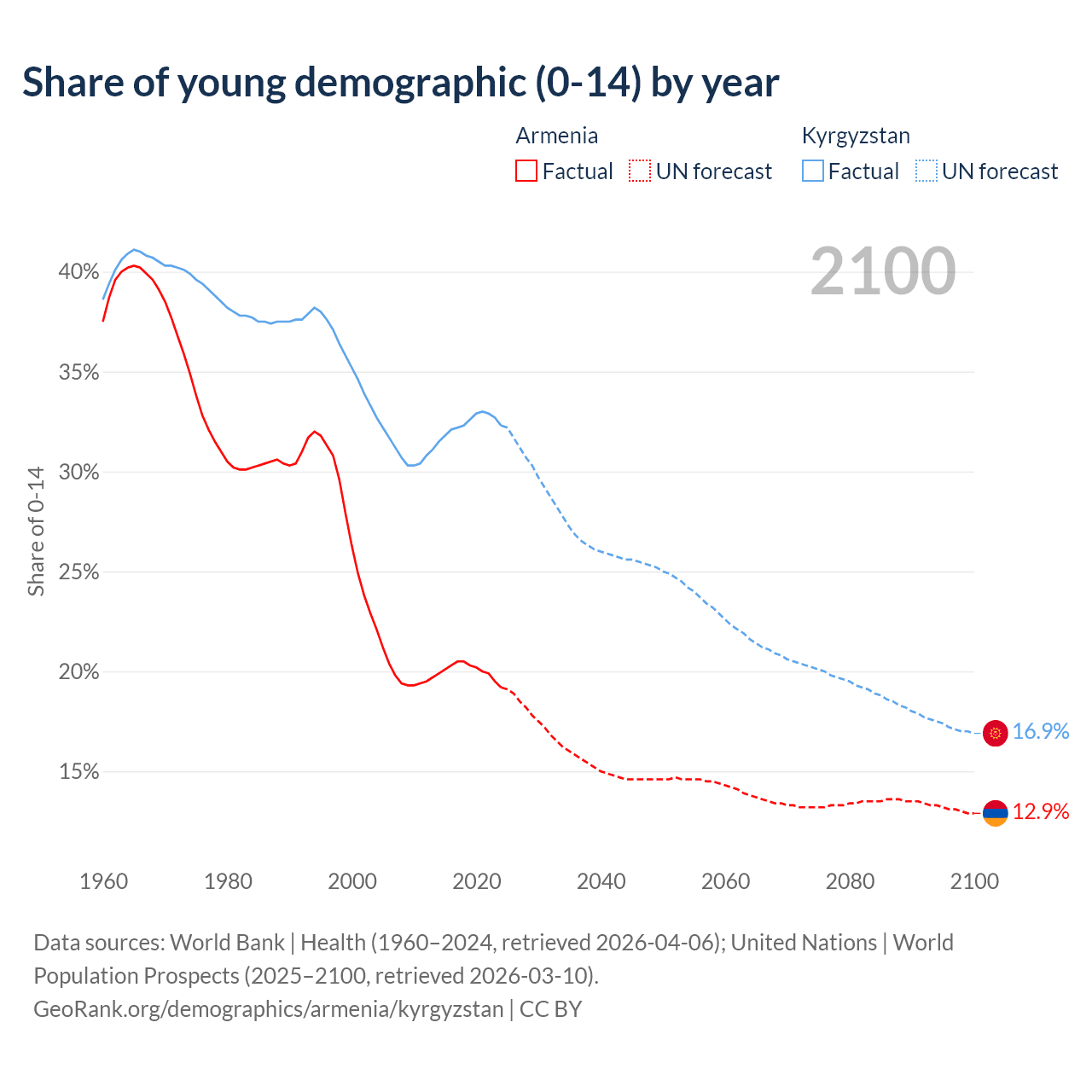 - The share of young demographic (0-15 years old) in Armenia is 19.2% vs 32.3% in Kyrgyzstan.