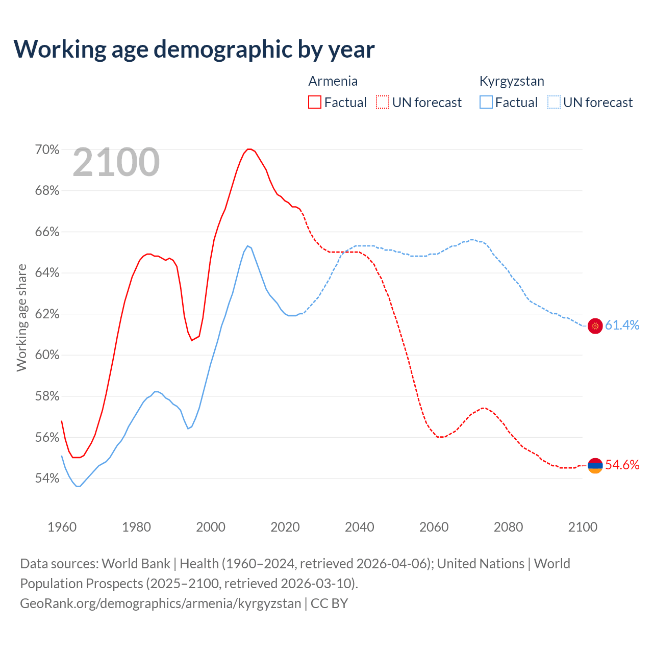 - Armenia has 2M working age adults (aged 15-64) vs 4.63M in Kyrgyzstan.
