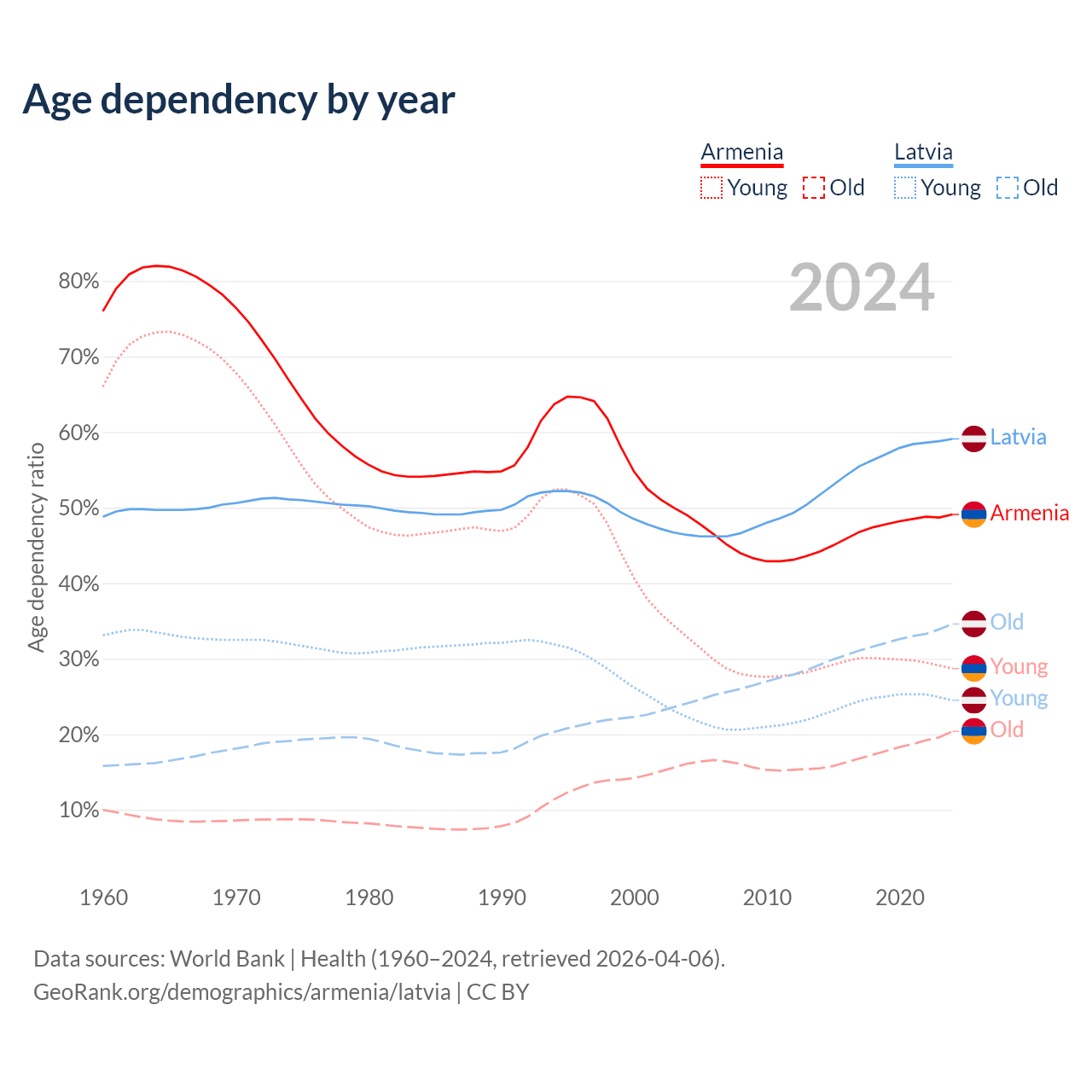 - Armenia is ranked 64/196 by median age (oldest to youngest) vs 20/196 for Latvia.