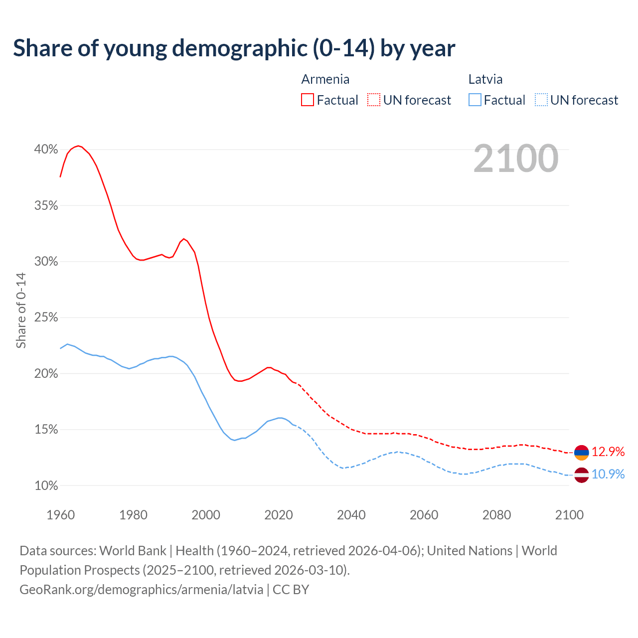 - The share of young demographic (0-15 years old) in Armenia is 19.2% vs 15.4% in Latvia.