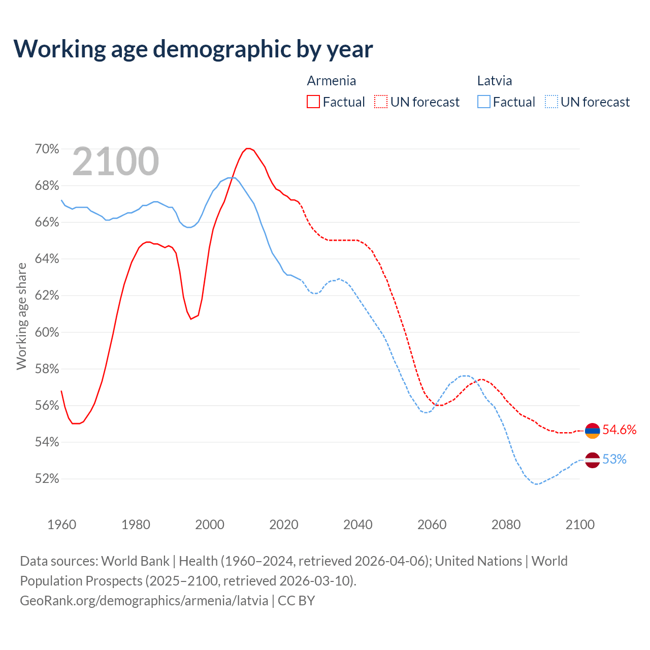 Median age Armenia vs Latvia, 1960-2100