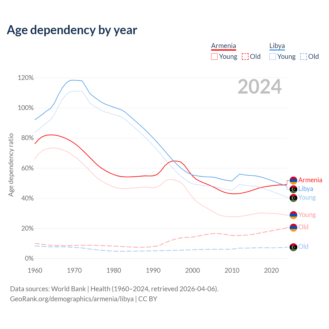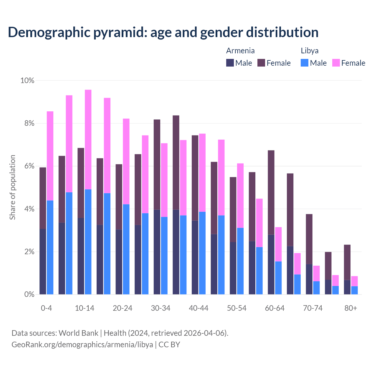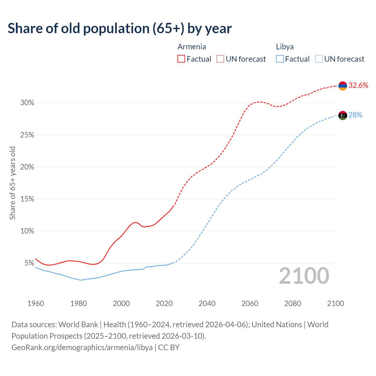 - The share of old-age demographic (65+) in Armenia is 13.7% vs 5.02% in Libya.