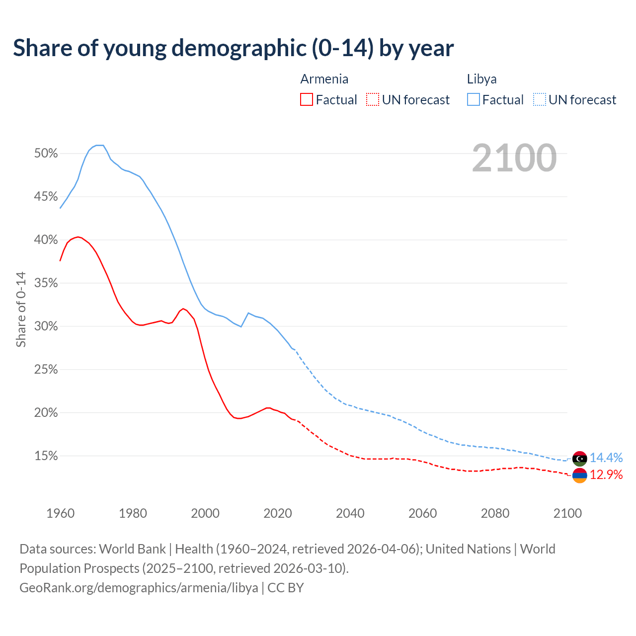 - The share of young demographic (0-15 years old) in Armenia is 19.2% vs 27.4% in Libya.