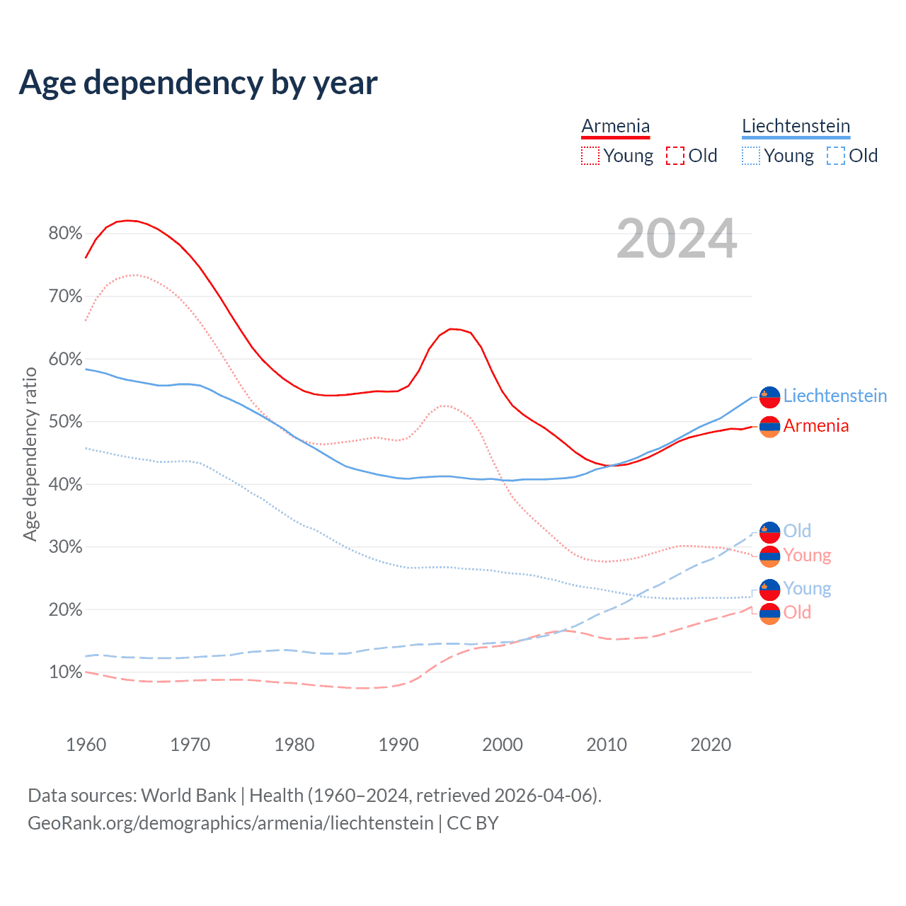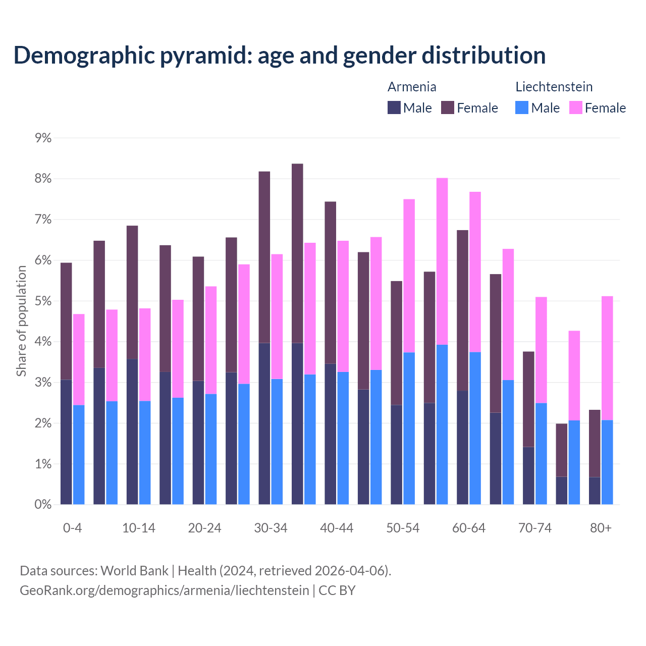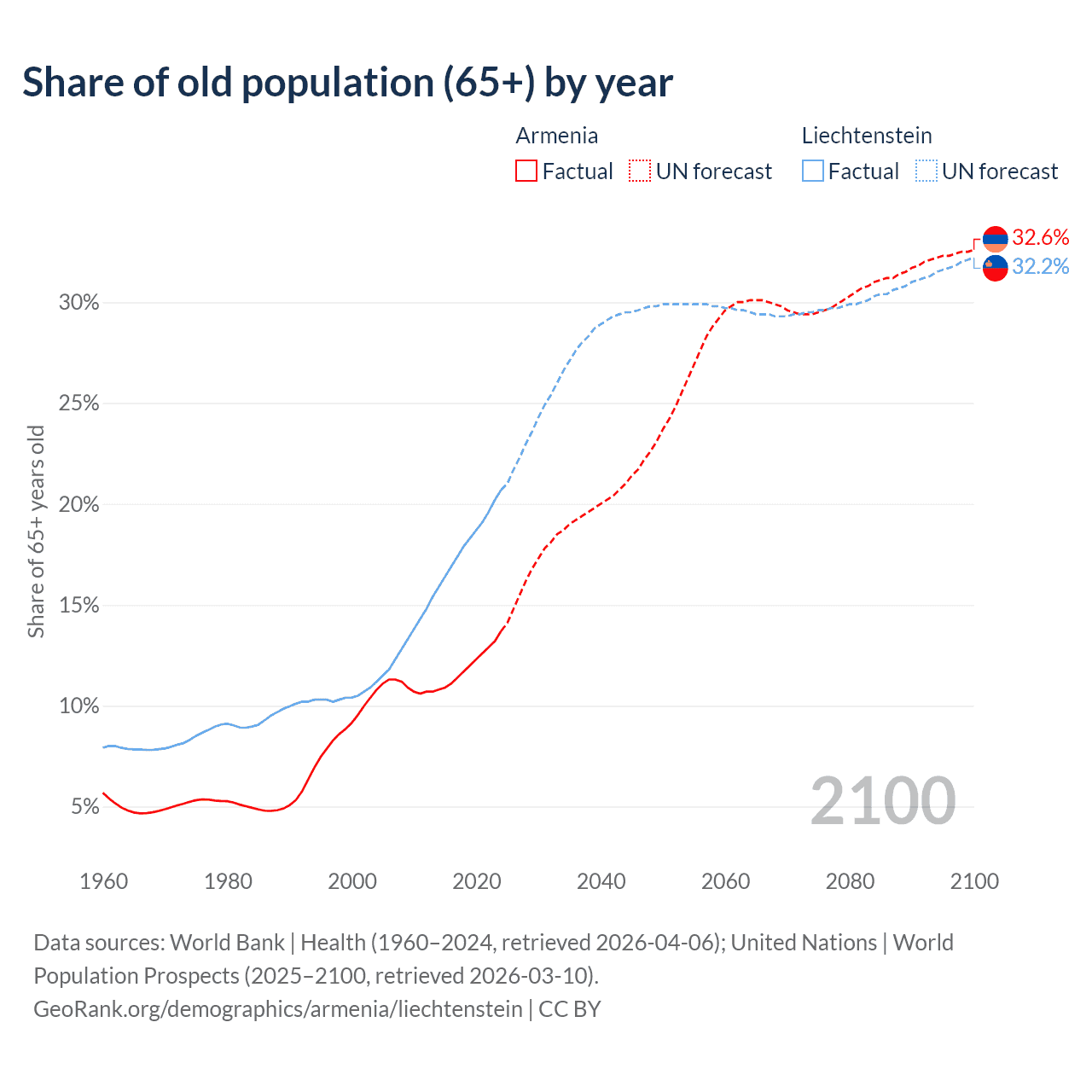 The share of older people aged 65 and over is 13.7% in Armenia and 20.7% in Liechtenstein. Life expectancy in Armenia compared to Liechtenstein .